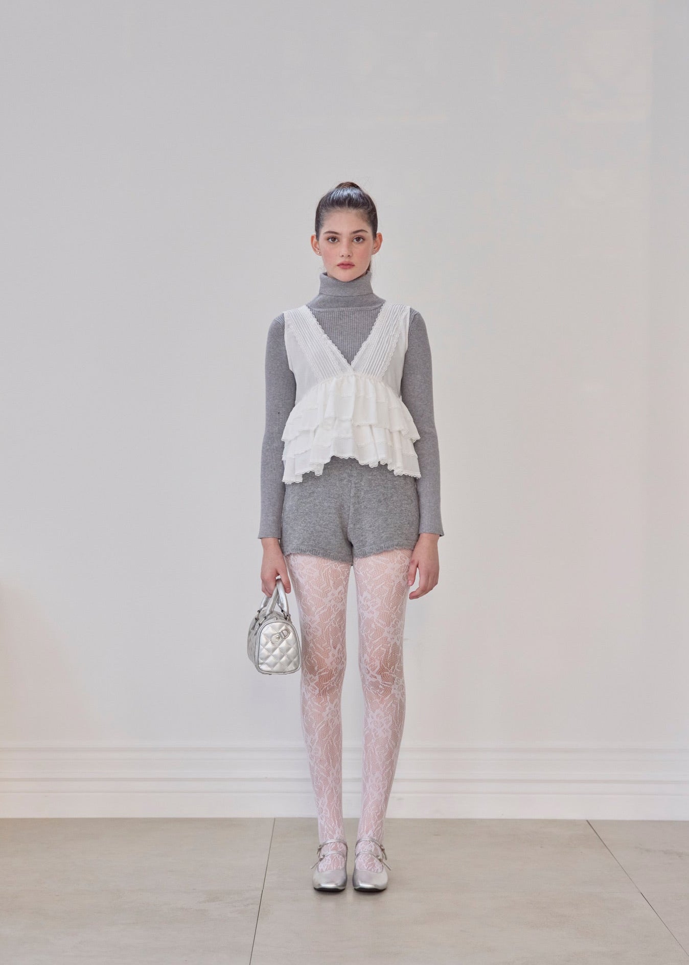 深めのVネックラインと細やかなレースディテールが、甘さを抑えつつ大人の上品さを引き立てます。