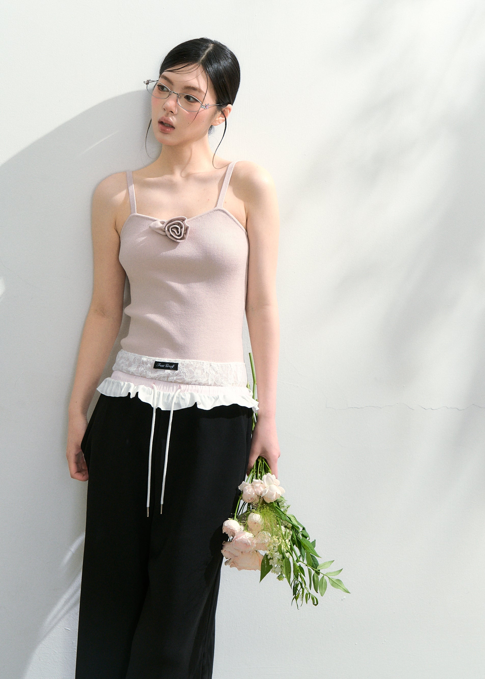 パステルカラーのウエストギャザーに、繊細なレースを重ねた、こだわりのダブルウエストデザインが目を引くスウェットパンツ。