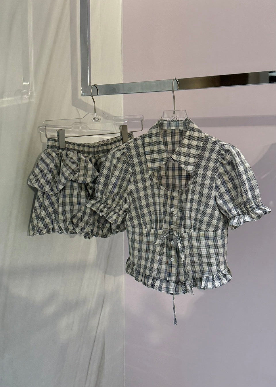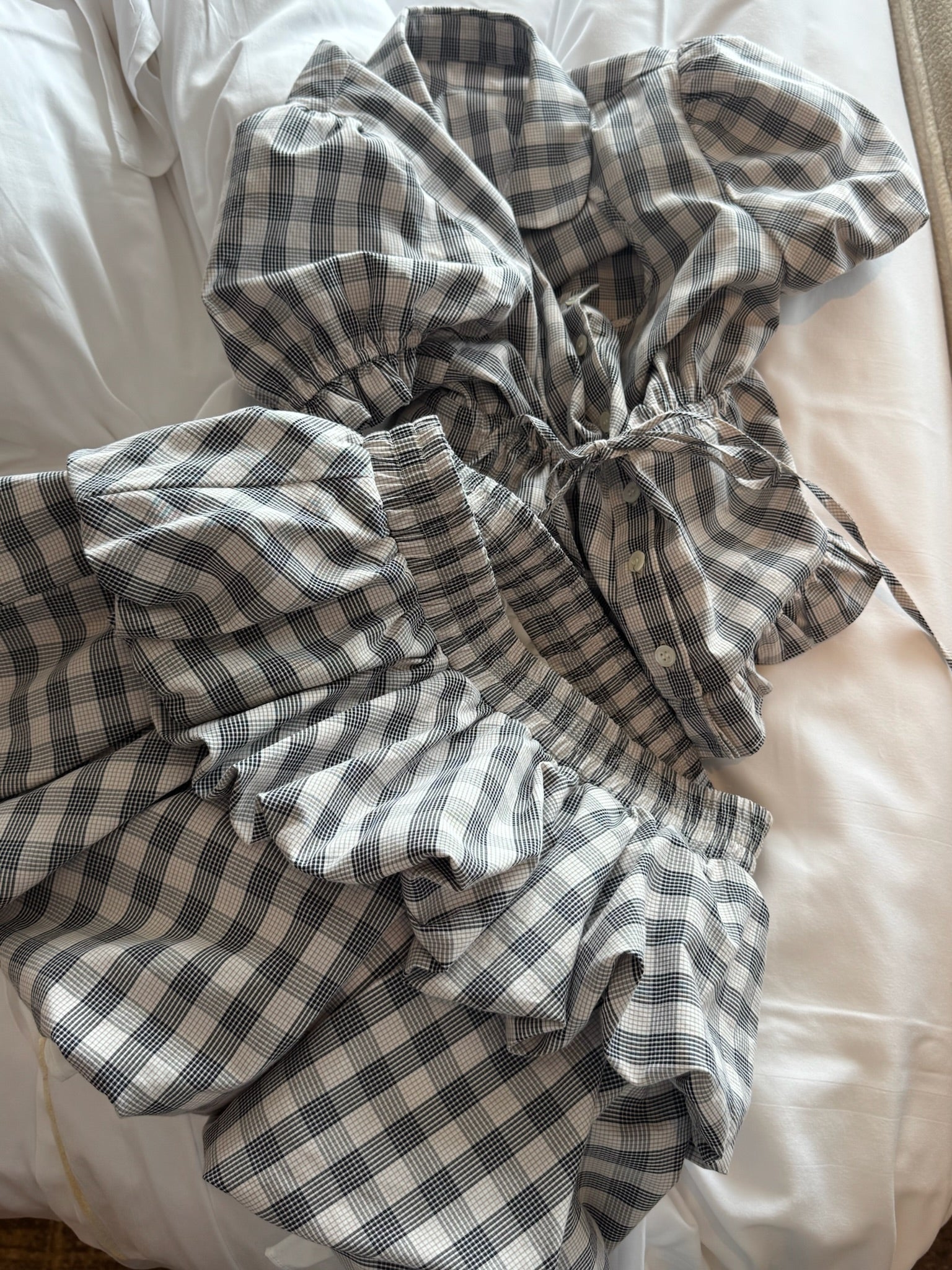 ギンガムチェック柄と、ふんわりパフスリーブが可愛さを引き立てるクロップドトップス。