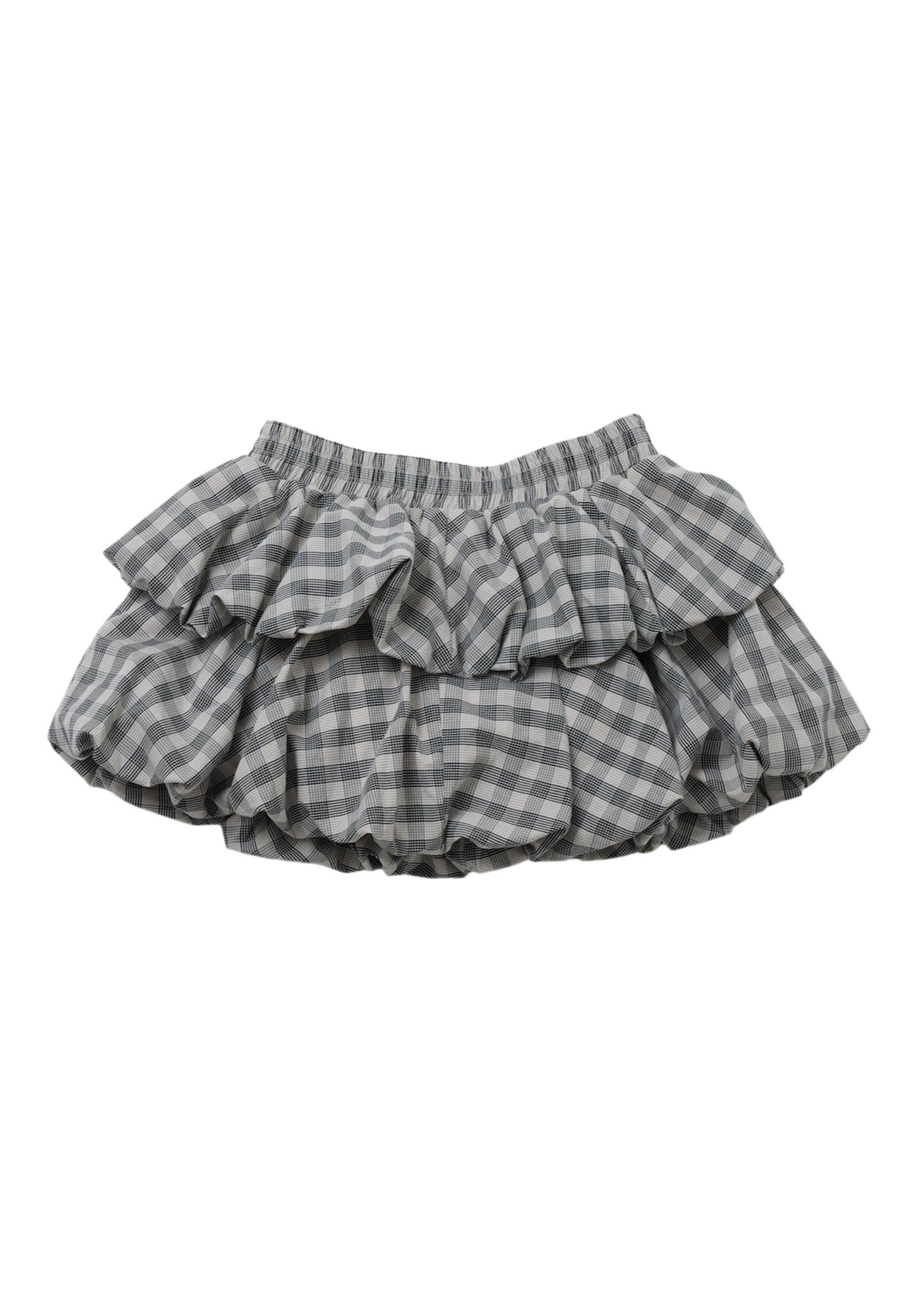 A gingham check skirt with a softly flared balloon silhouette, lavishly layered with double frills.