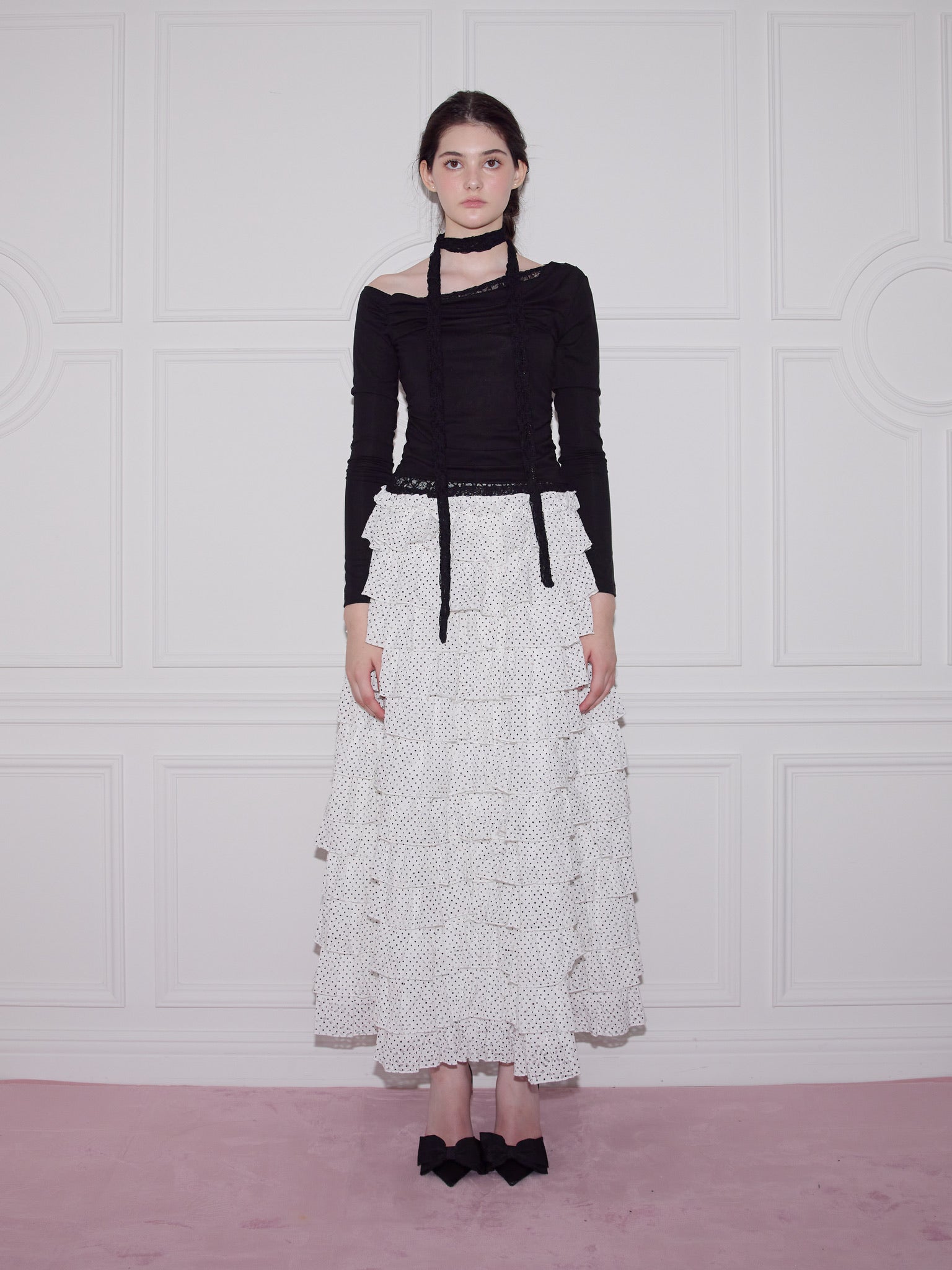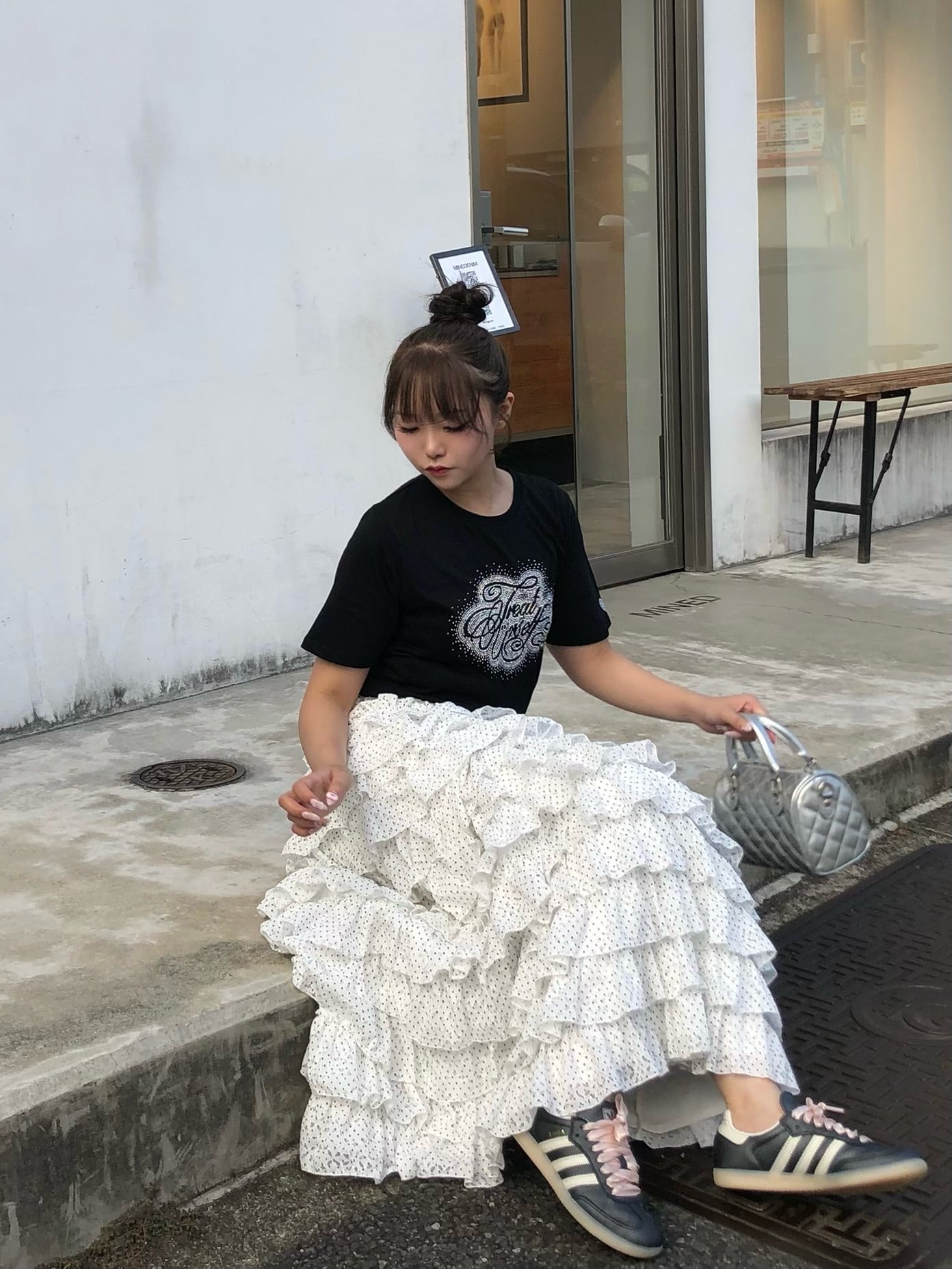 歩くたび視線を奪うドット柄のレースフリルロングスカート。 何段にも重ねたティアードフリルがふんわり広がり、歩くたびドラマチックに揺れるシルエットが魅力です。 軽やかなレース素材と細かなドットが、ガーリーなムードを引き立てながらも大人っぽさをプラス。 Tシャツやタンクトップでカジュアルに、ブラウスやキャミでフェミニンにと、合わせるトップス次第で、季節を問わず着まわせます。デイリーにも特別なシーンにも映える、主役級の一枚です。