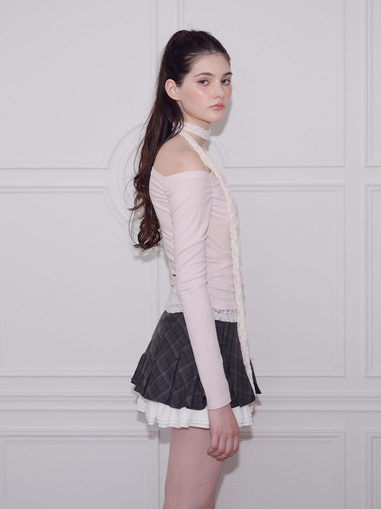 上段はきれいなフレア感のあるプリーツ、裾からのぞくホワイトフリルが軽やかなアクセントに。