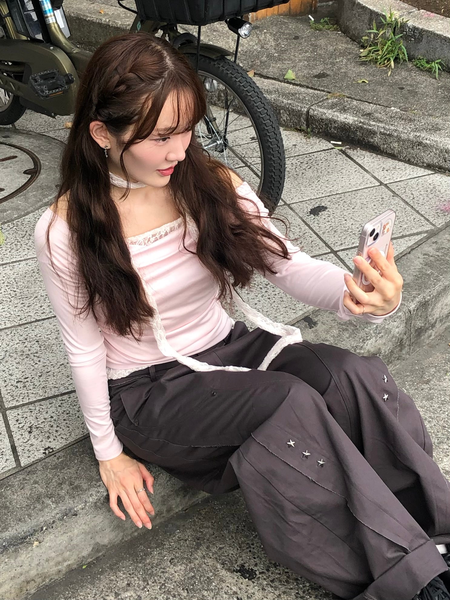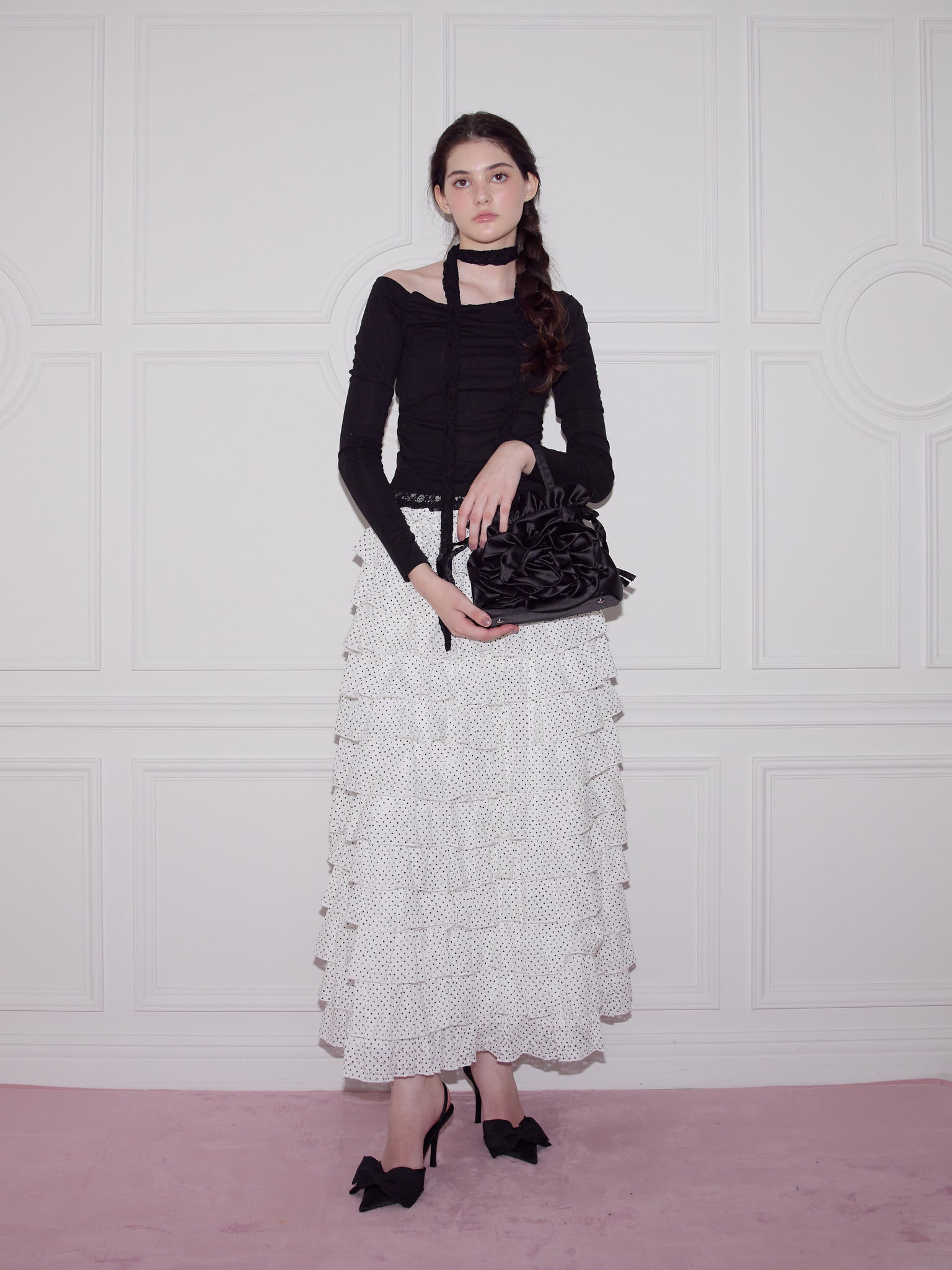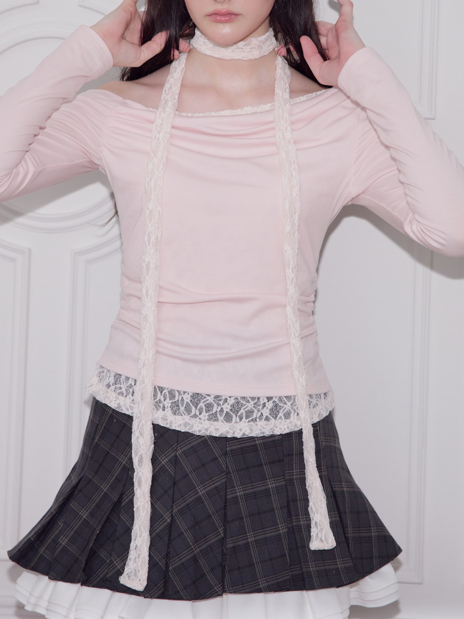 長く垂れるレースストラップは、リボンに結んだり、ネクタイとして使用したりアレンジ自在。シンプルな中でも、ディティールを詰め込んで。デイリーから特別なお出かけまで甘く彩ります。