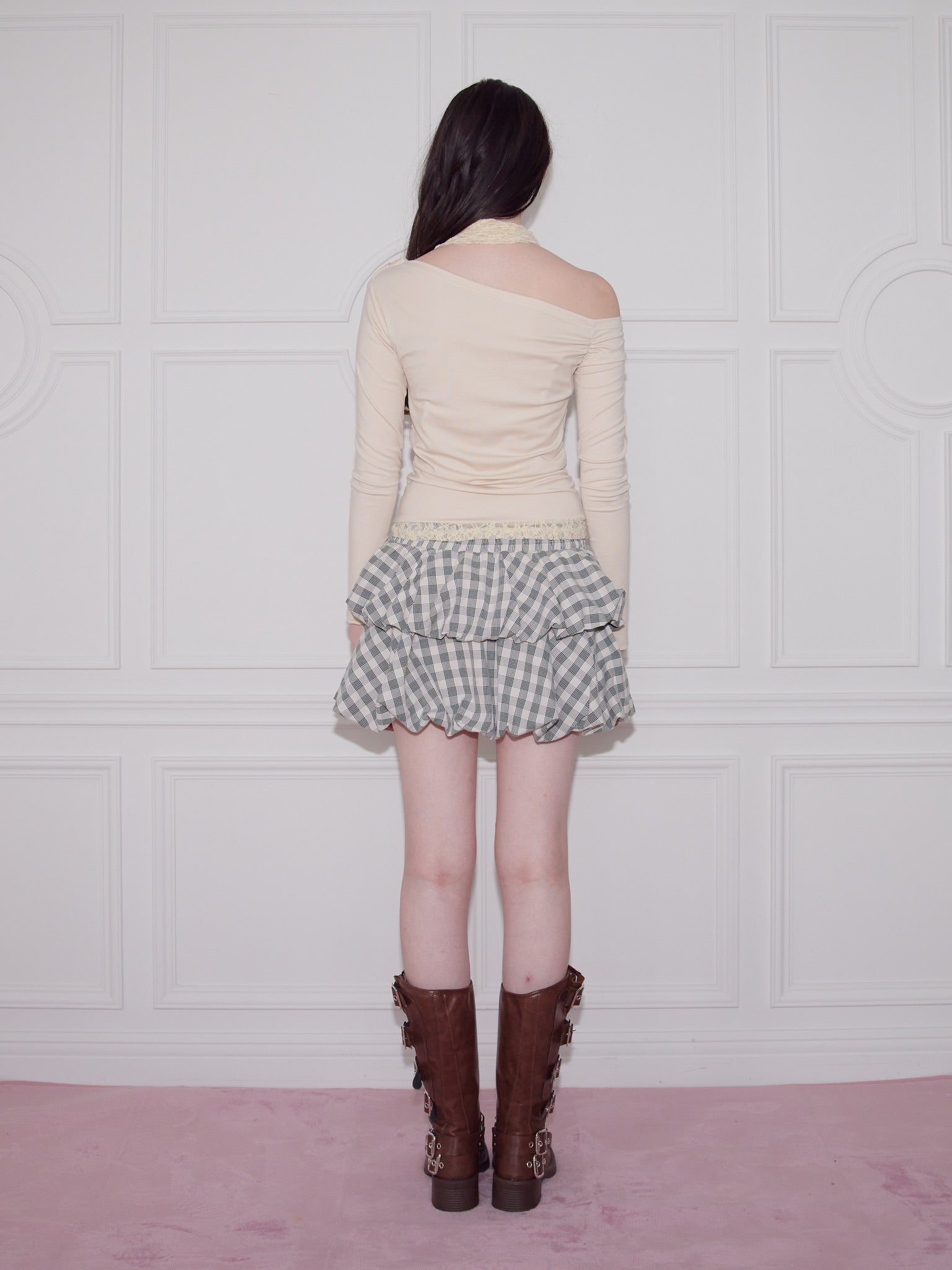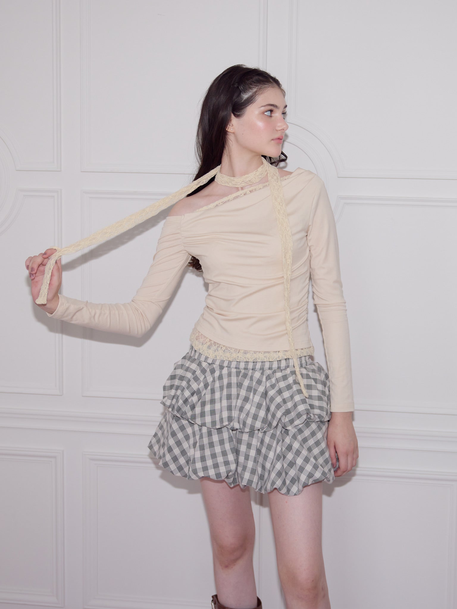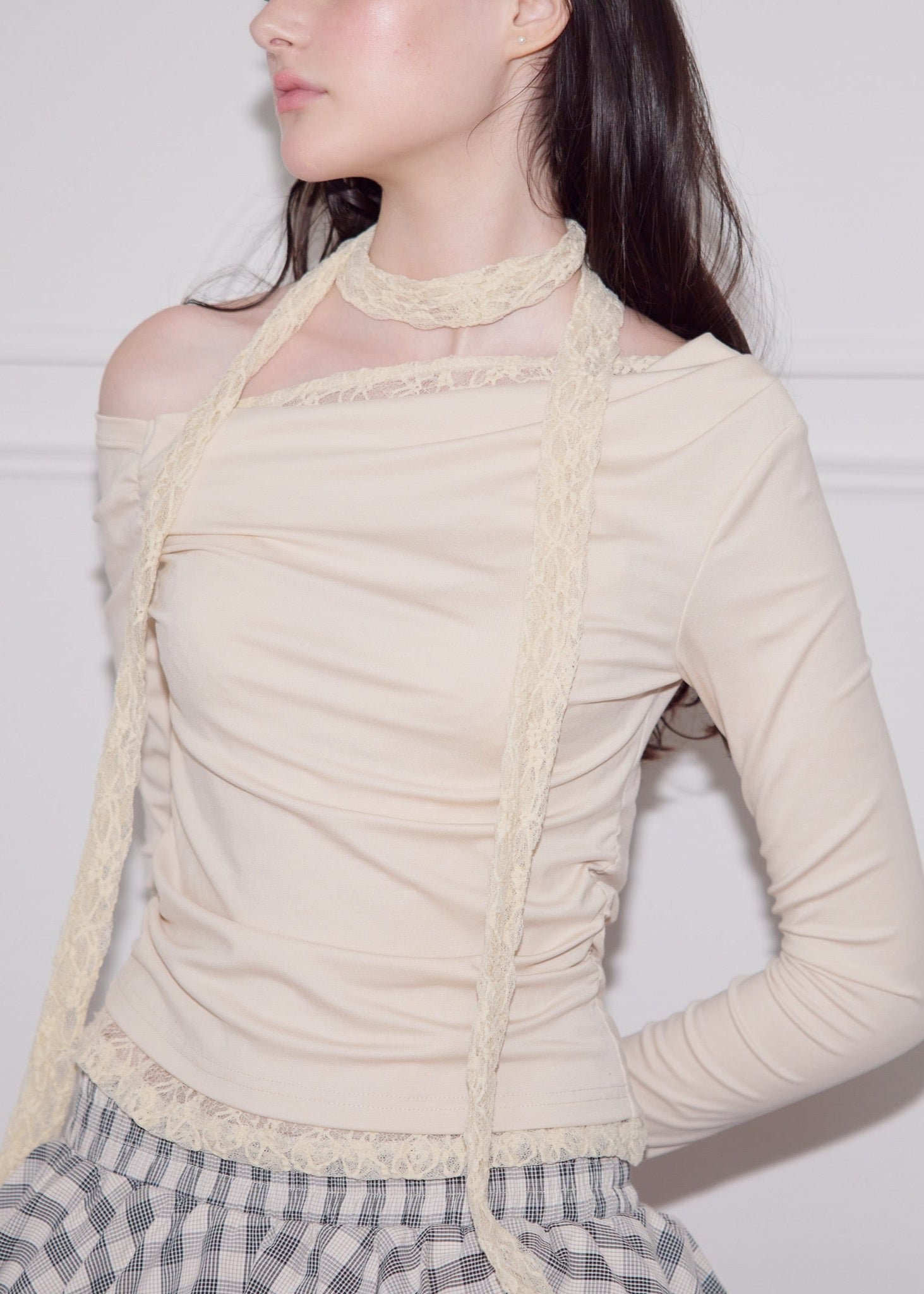 A long-sleeve top with delicate lace that beautifully enhances the body line, embodying Treat’s signature romantic touch.