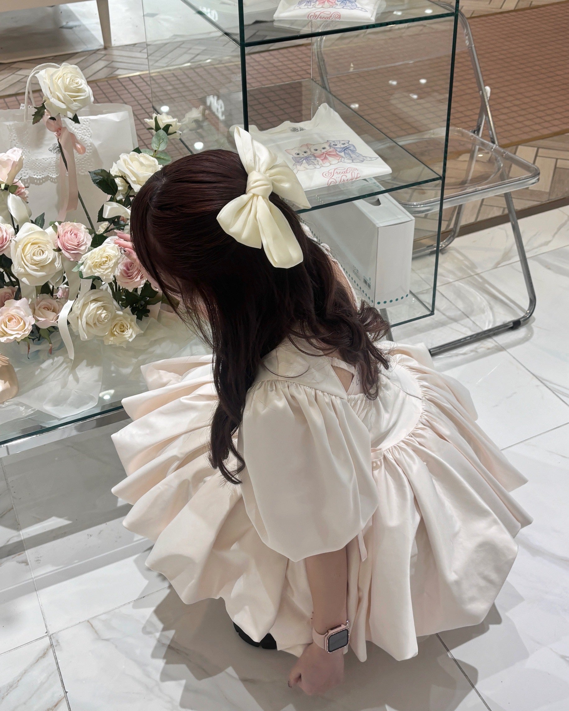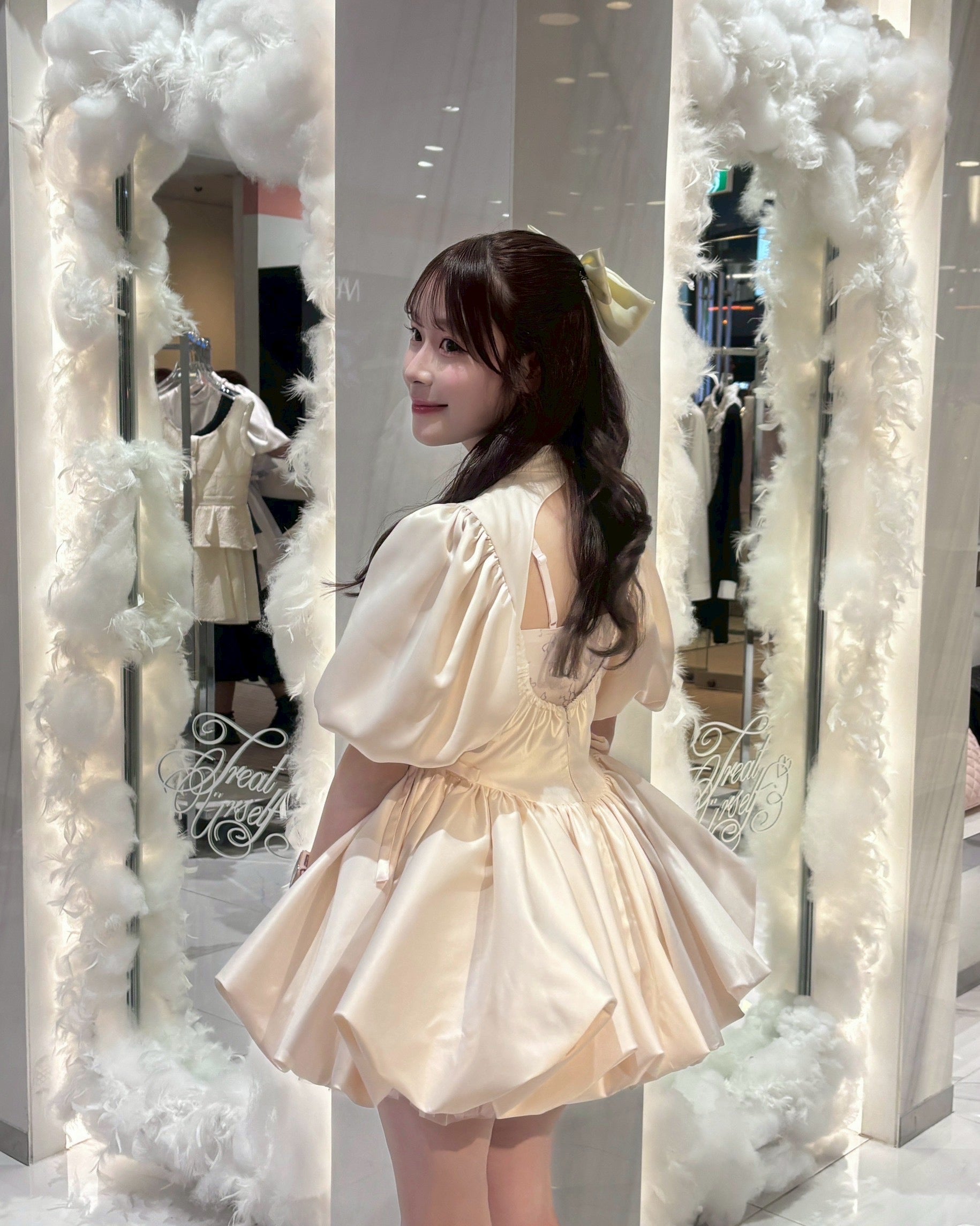ウエストラインの切り替えとボリューミーなバルーンペプラムでスタイルアップを叶え、サイドのリボンもワンポイントに。