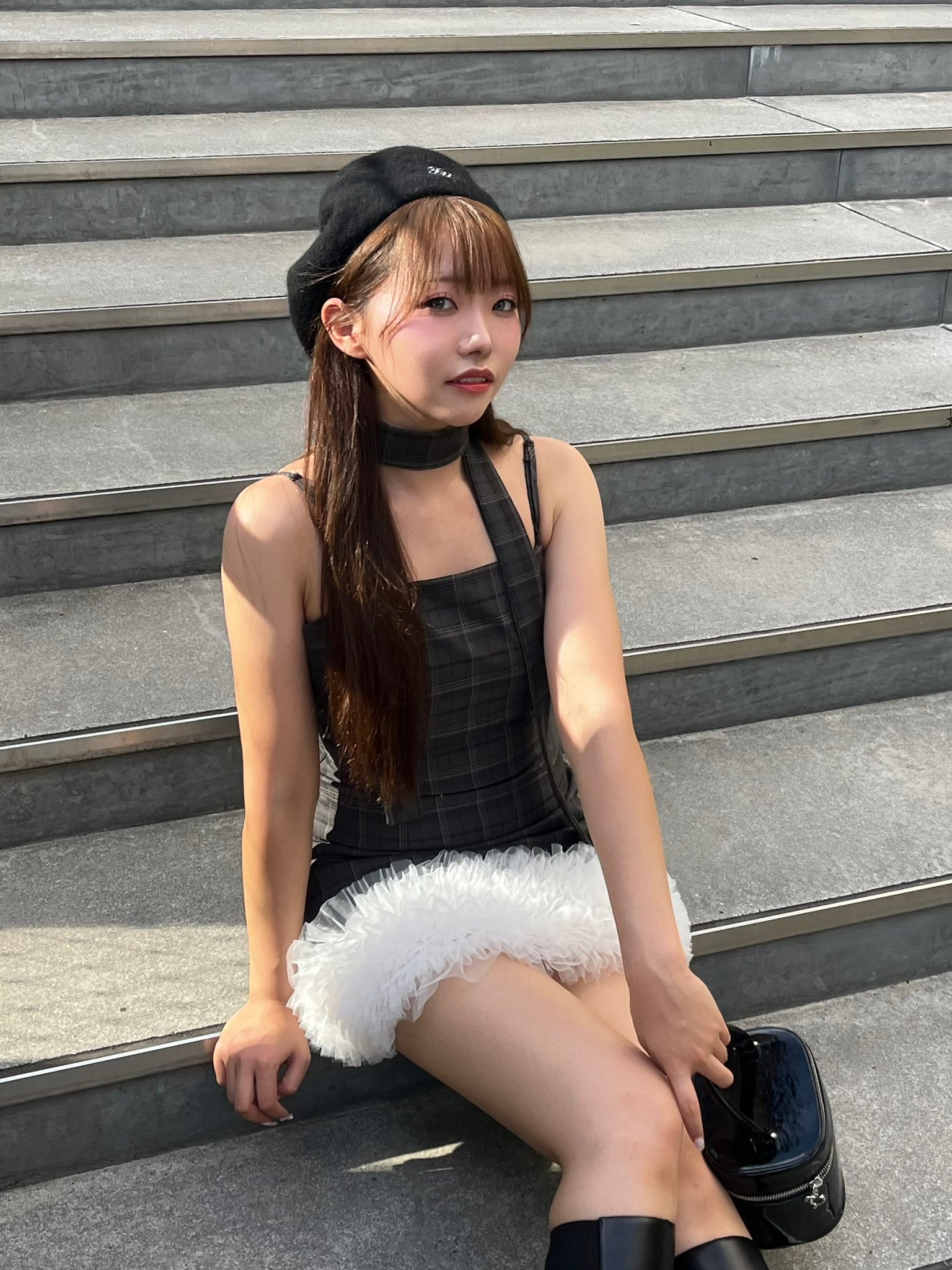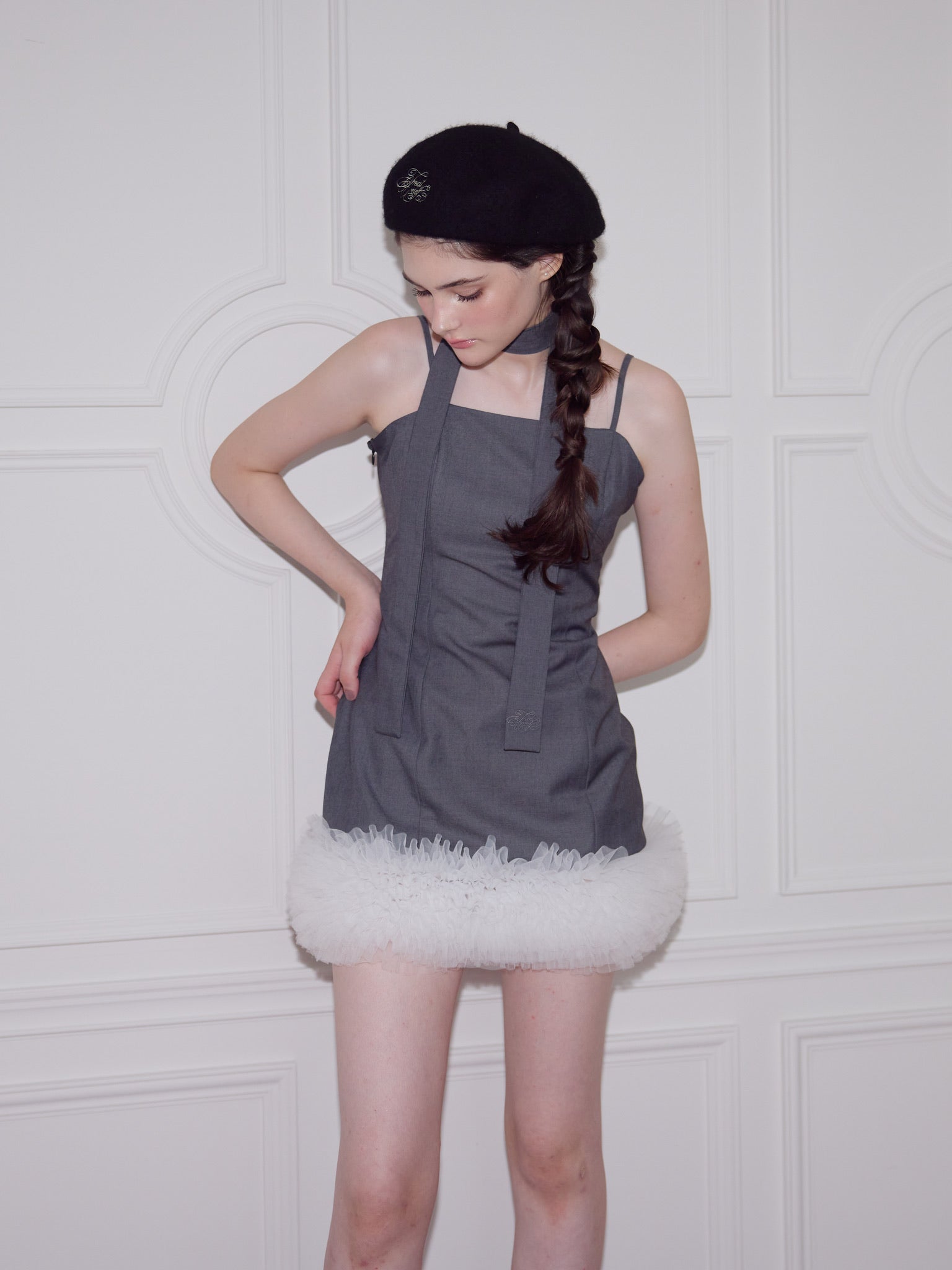 A mini dress crafted from classic suiting fabric, adorned with fluffy, voluminous tulle♡The clean lines of the square neckline and the sleek, fitted silhouette bring out a refined elegance with a modern edge.