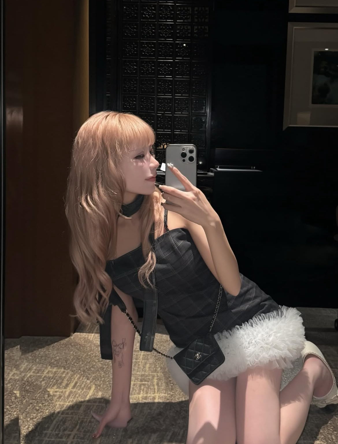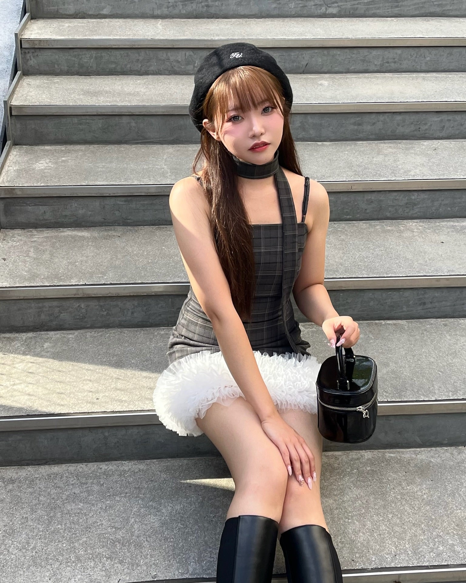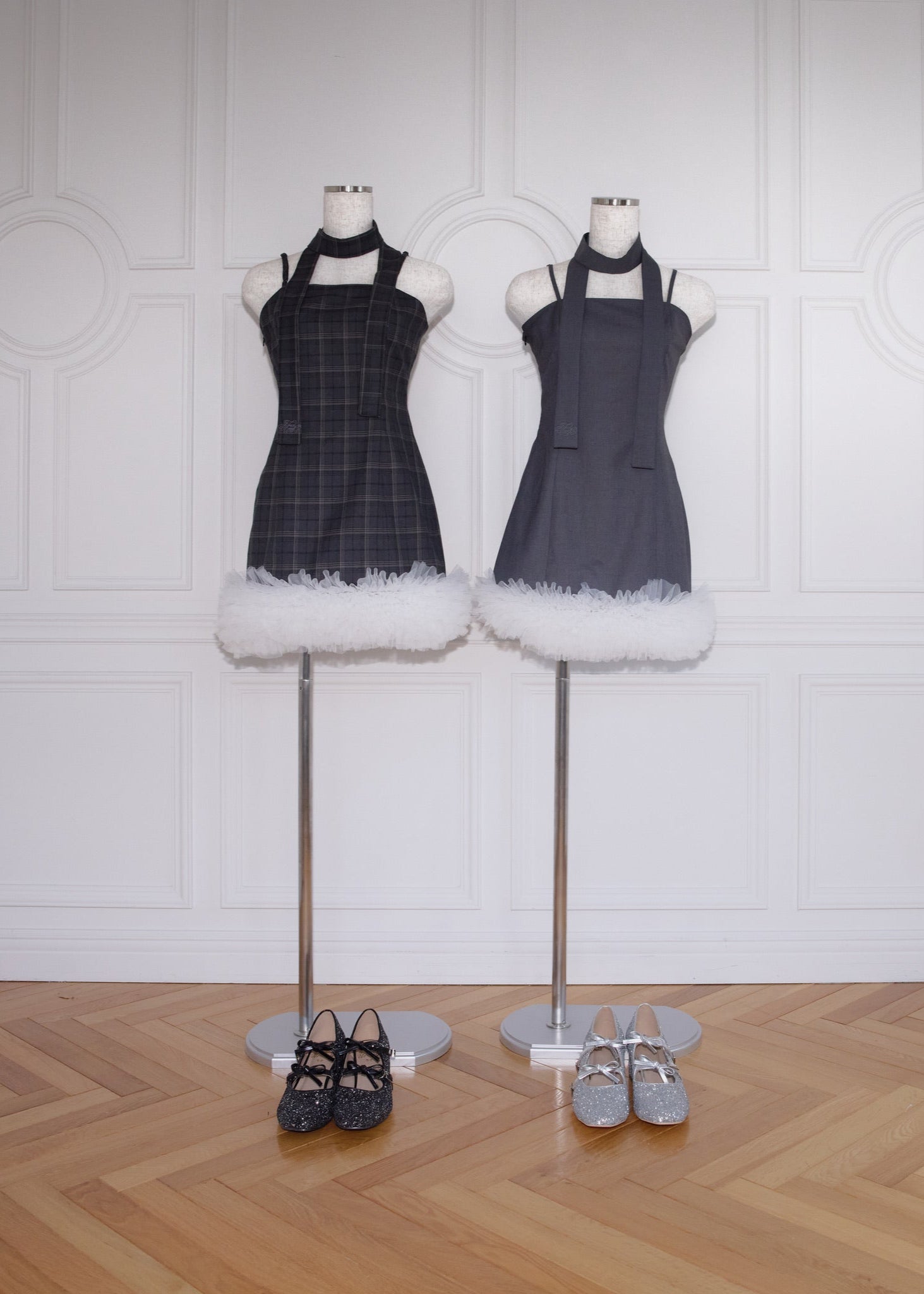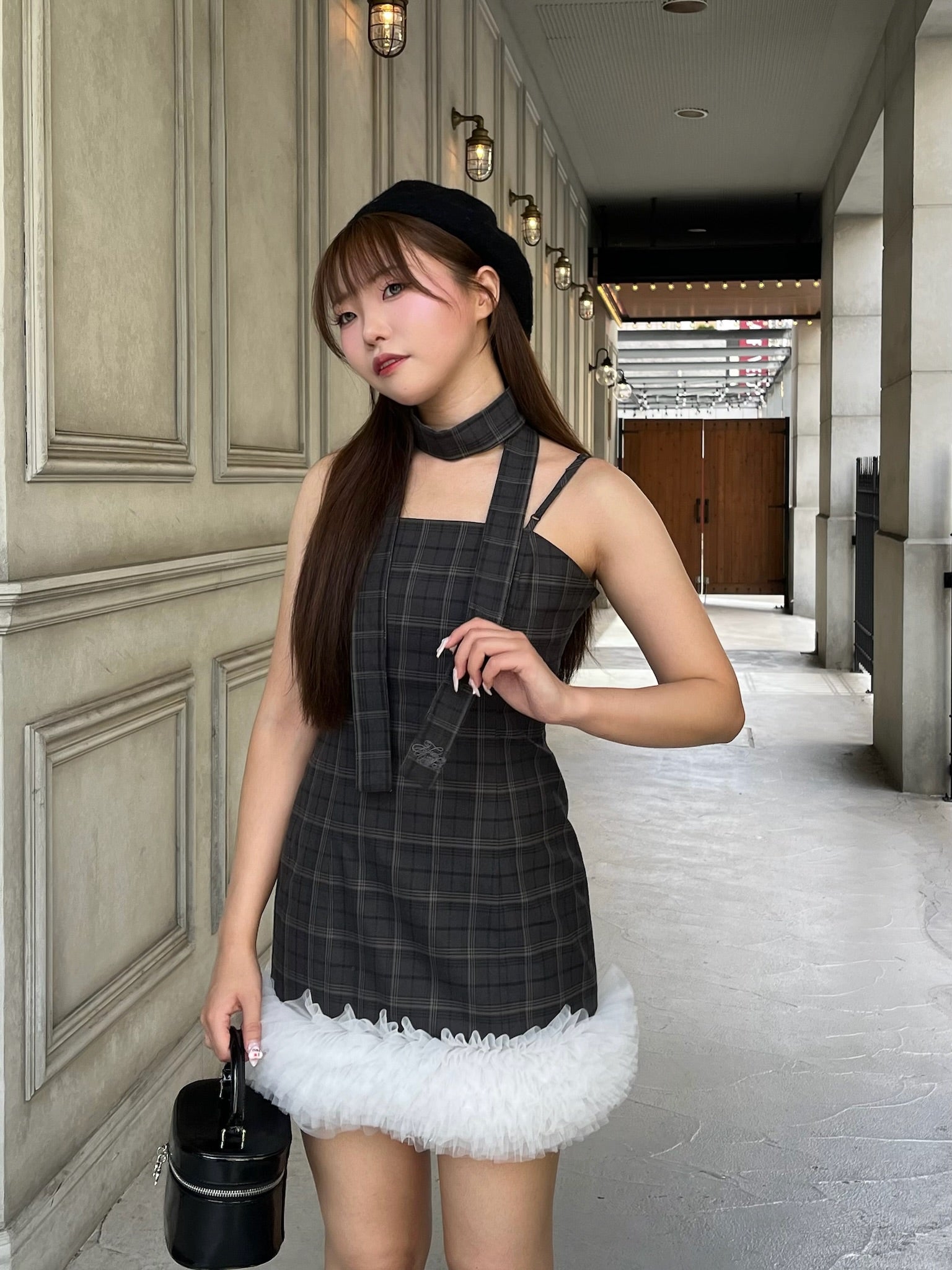 クラシカルなスーツ生地に、ふわふわのボリュームチュールをあしらったミニドレスが登場♡直線的なスクエアネックとタイトなシルエットが、大人っぽさとモード感を引き立てます。