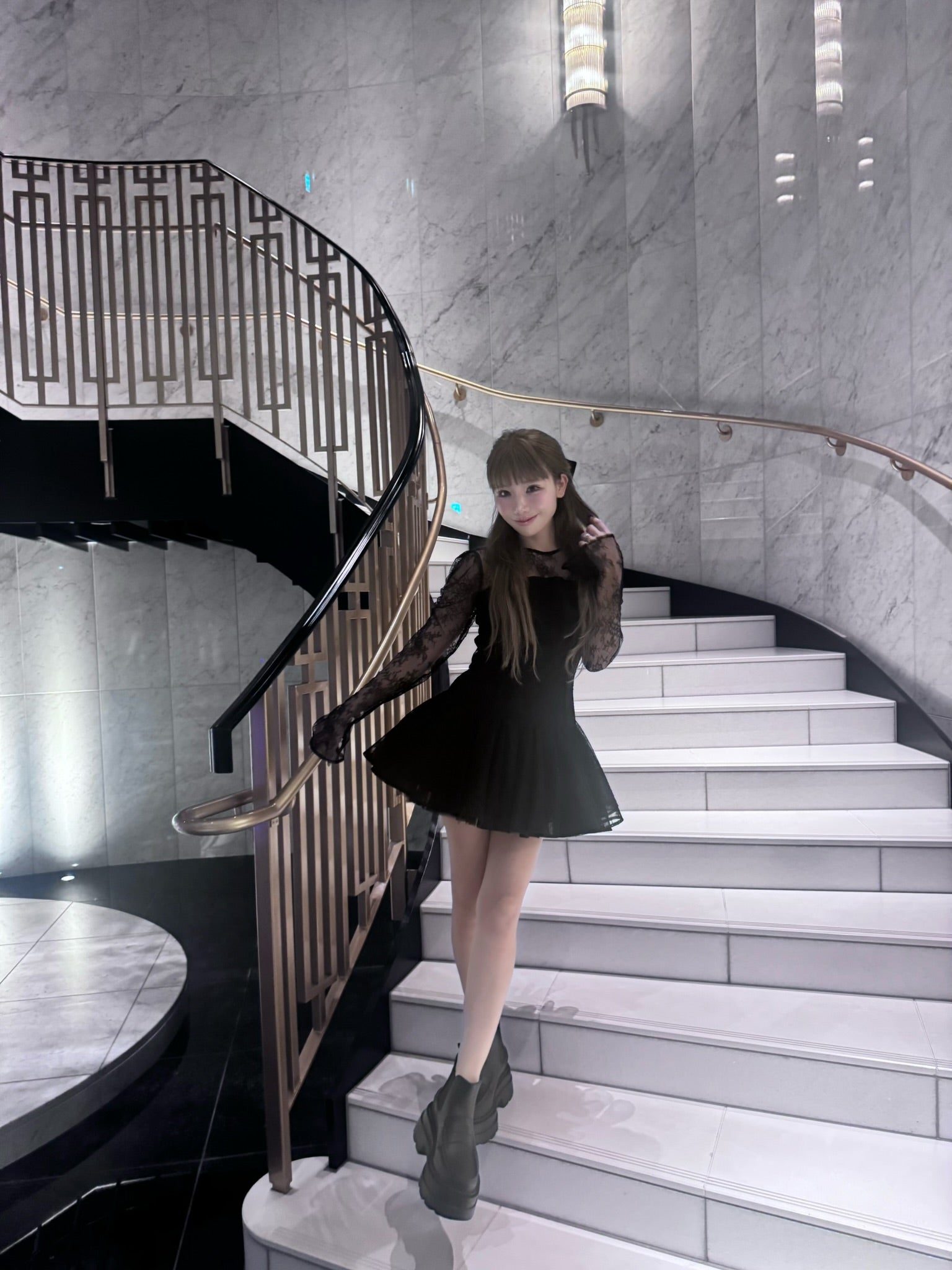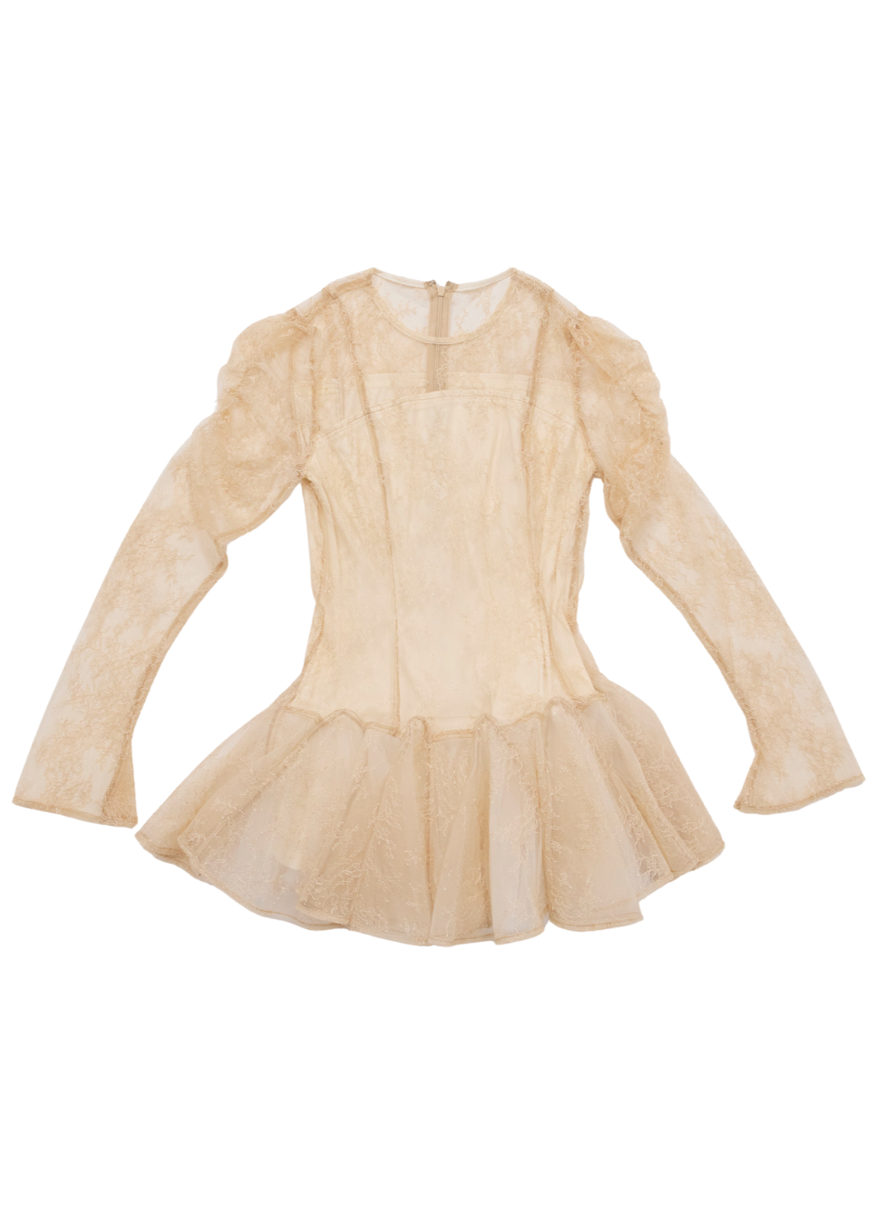 A lace dress combining doll-like charm with classic elegance. Its three-dimensional silhouette hugs the body, perfectly balanced with a softly flared skirt. Sheer sleeves and sparkling lace create a delicate look from every angle.