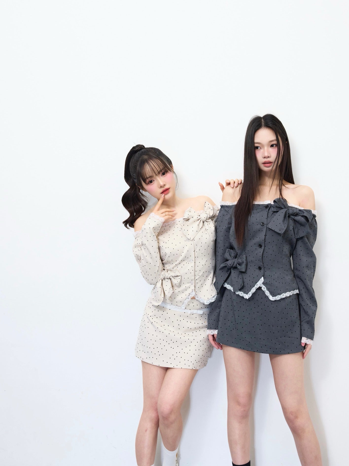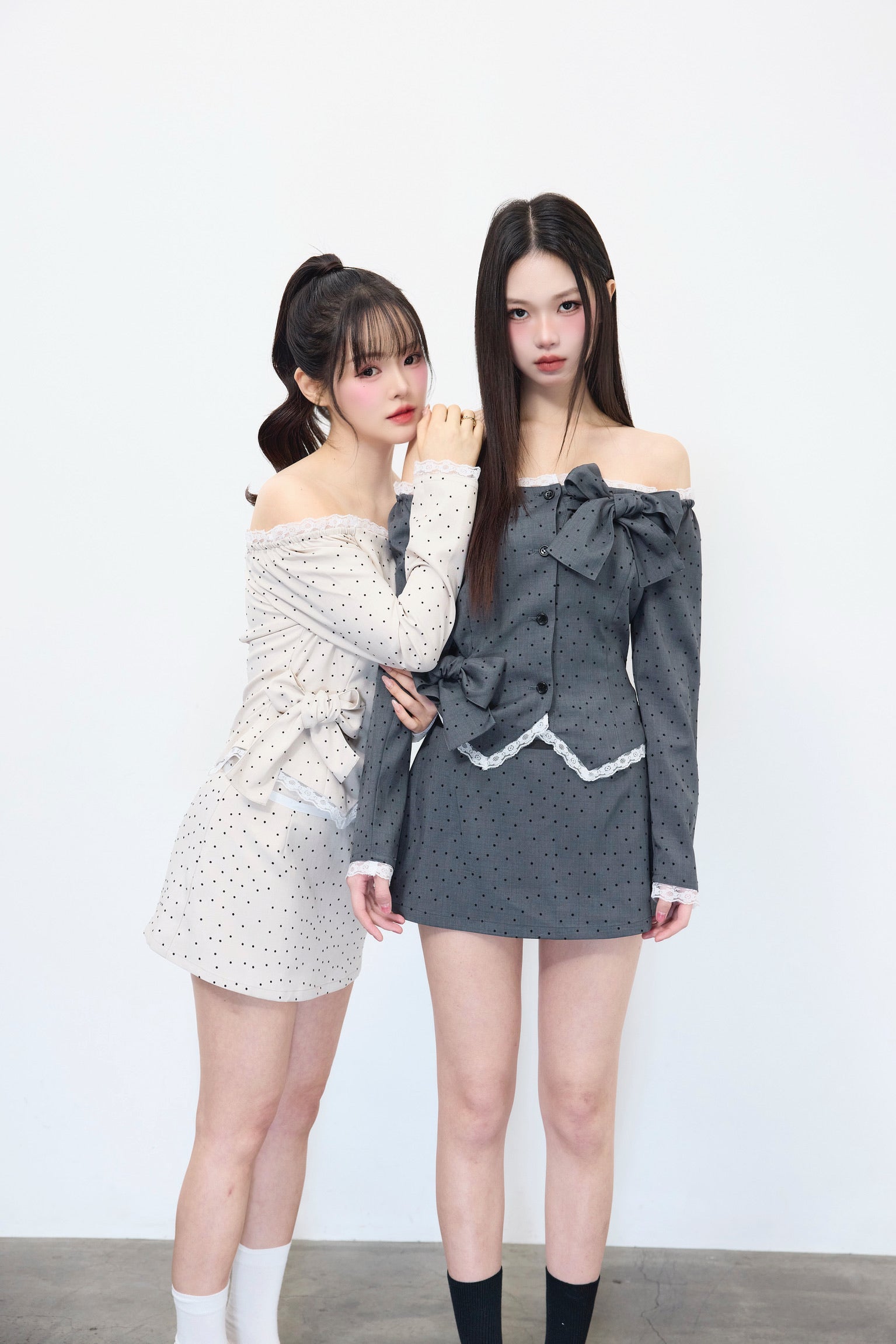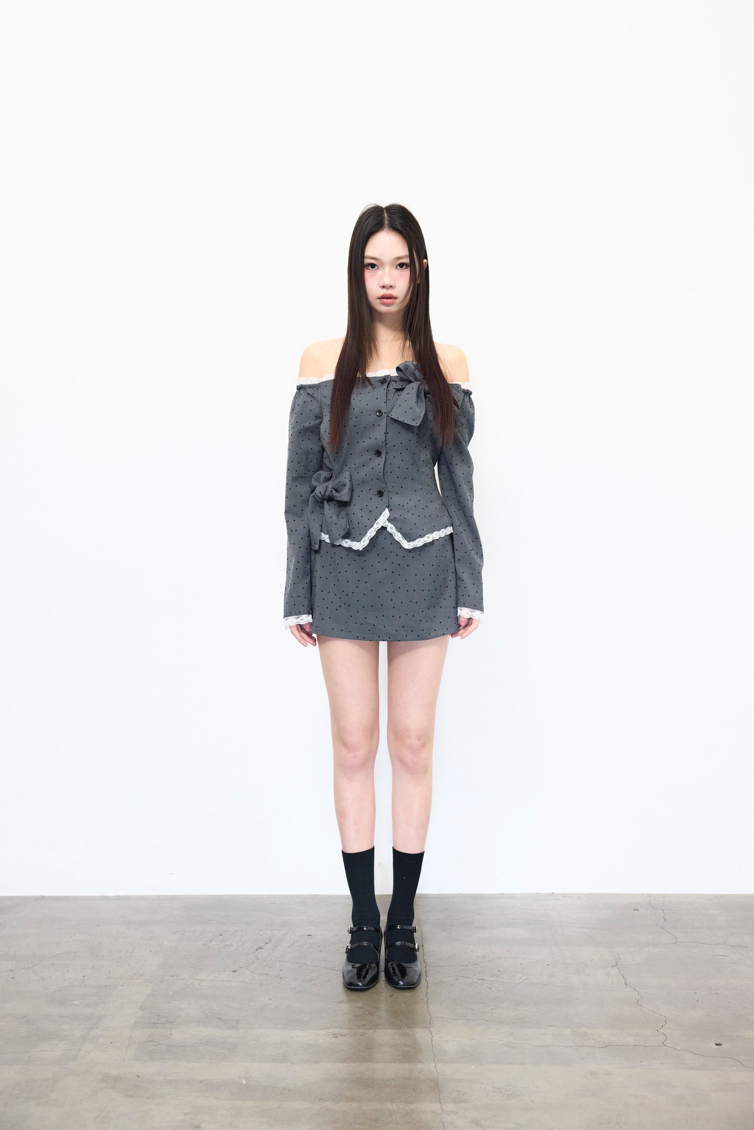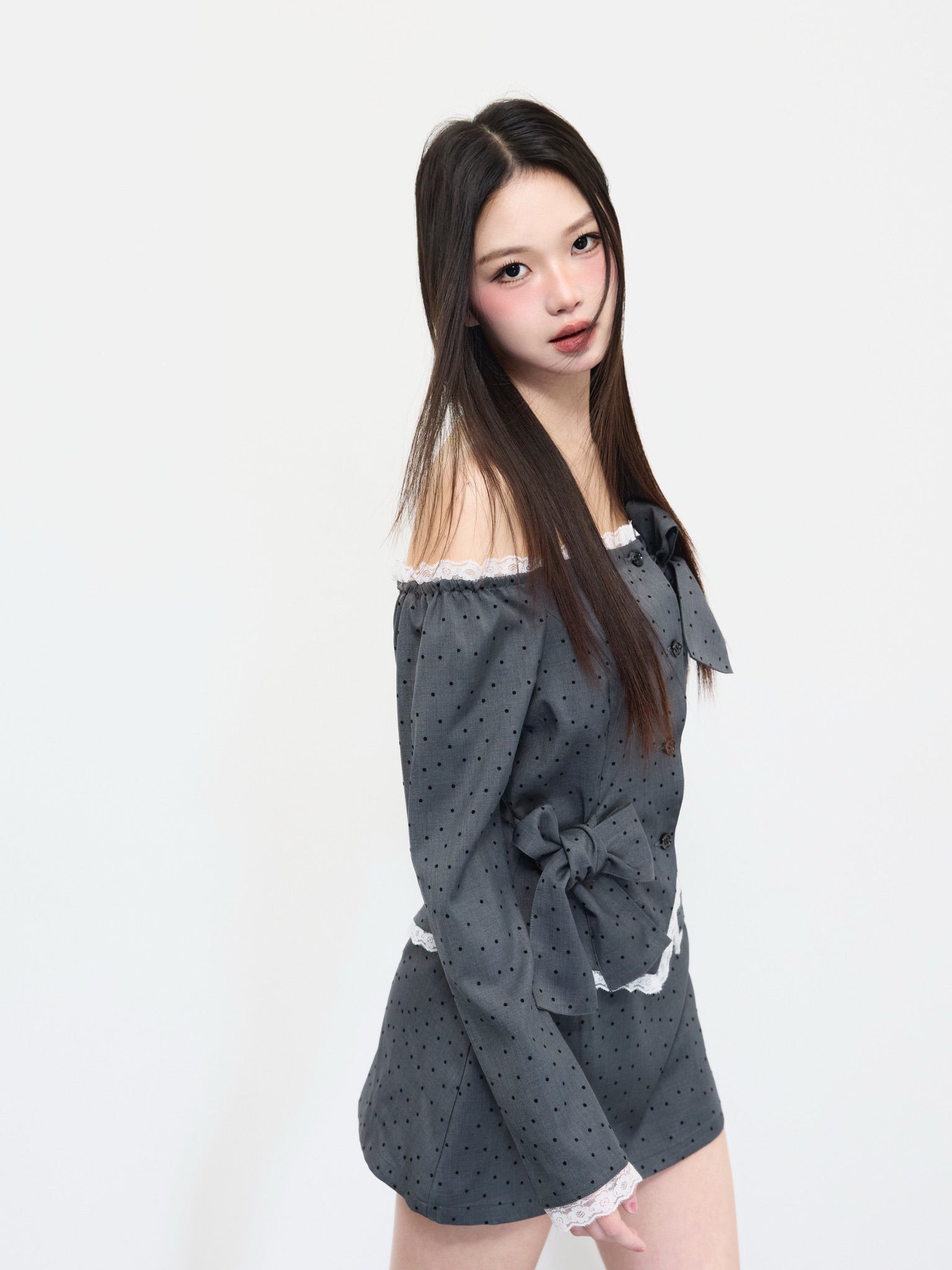 フェミニンなオフショルダードット柄トップス。