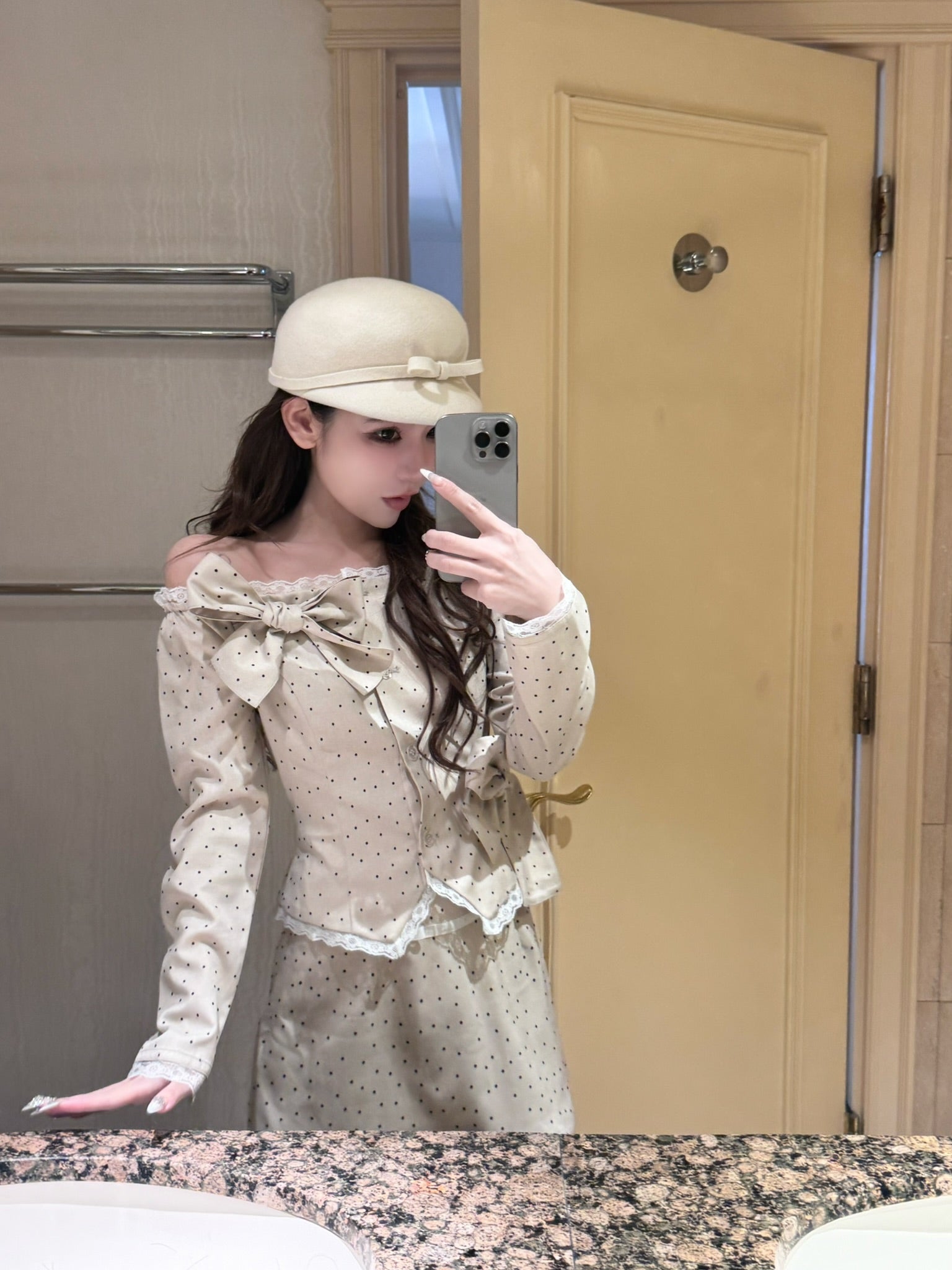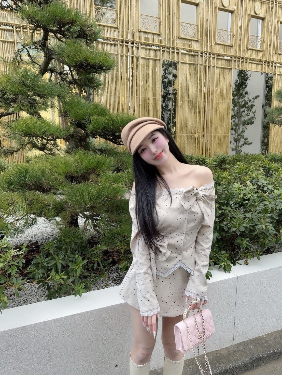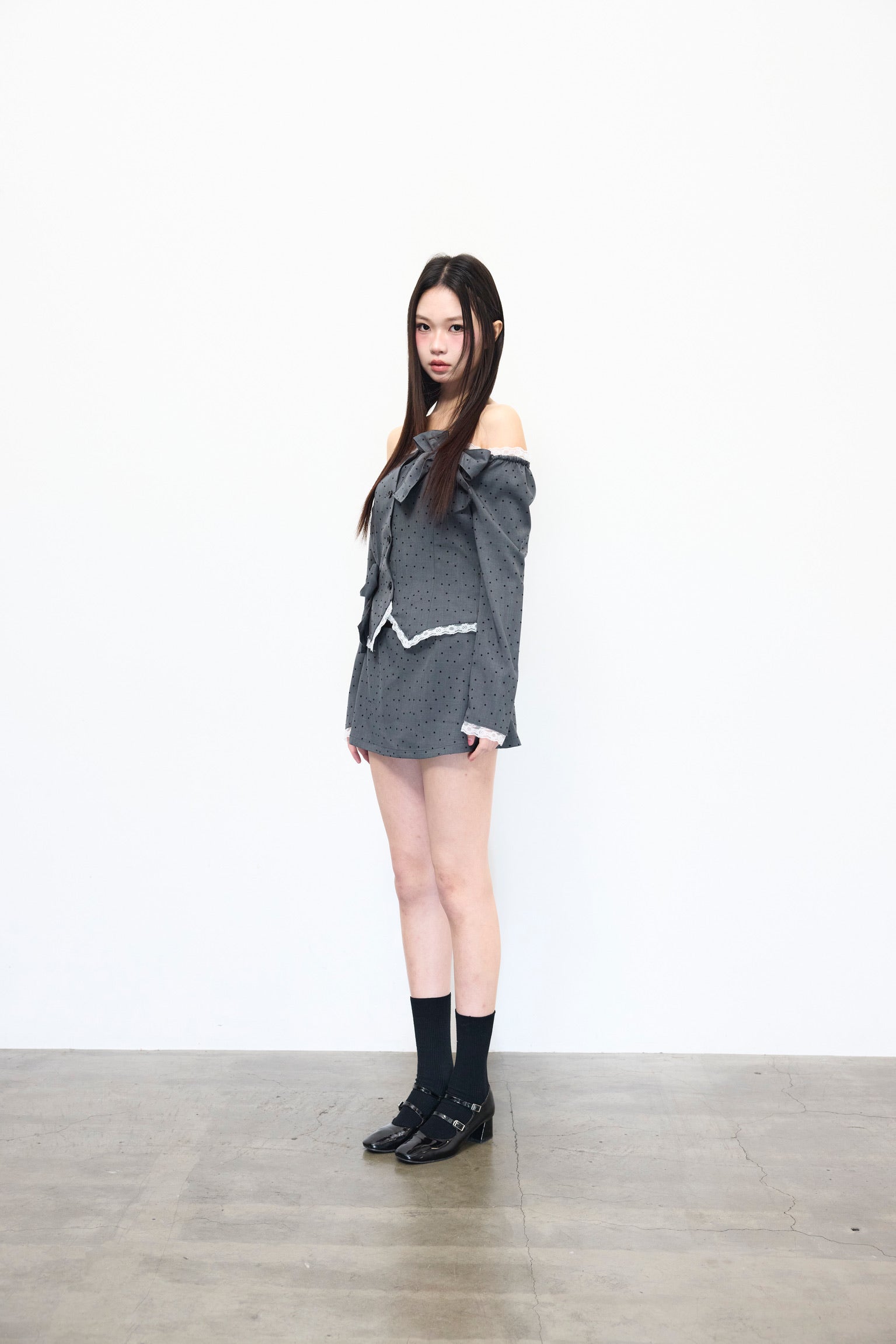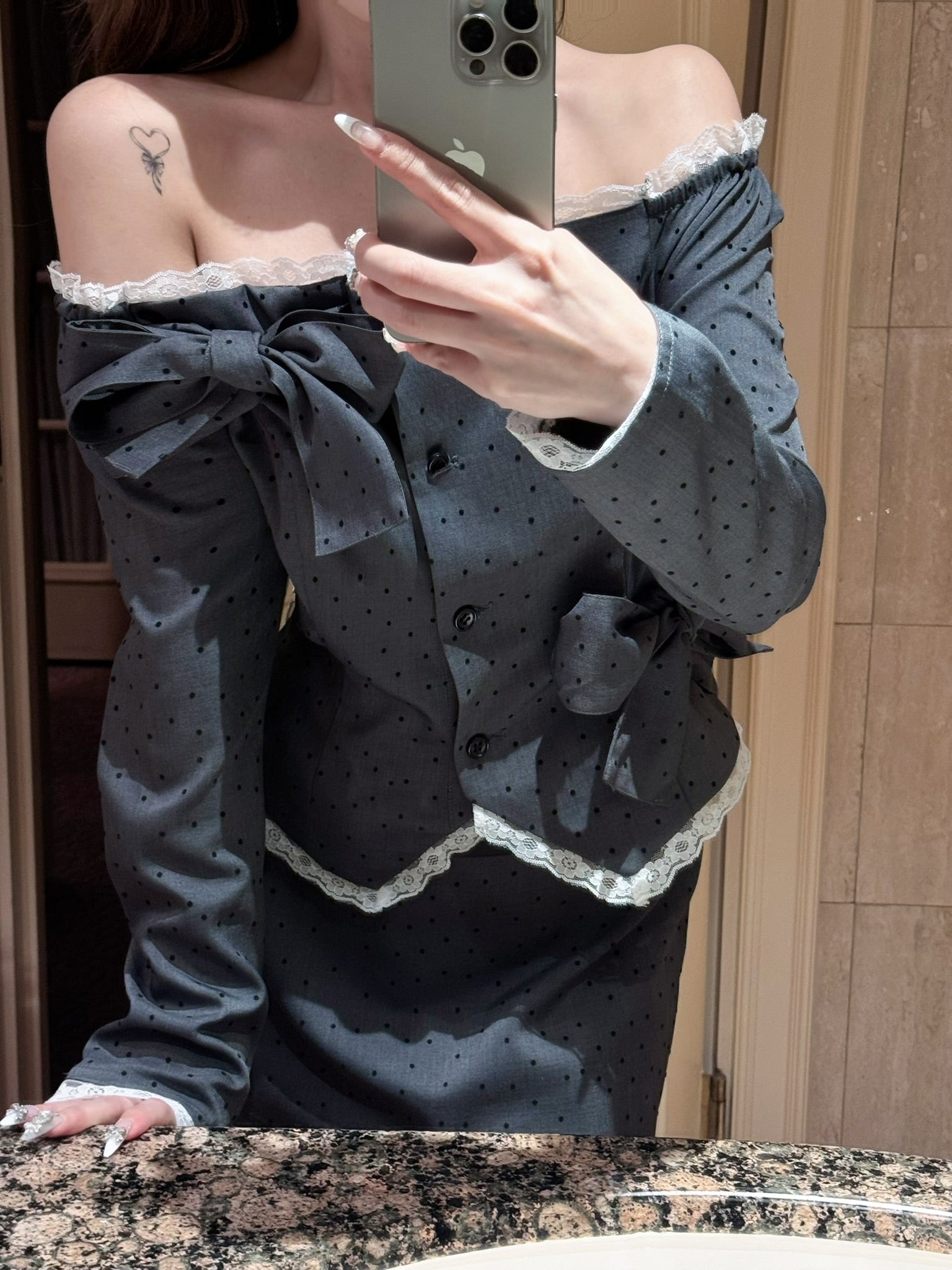 フェミニンなオフショルダードット柄トップス。