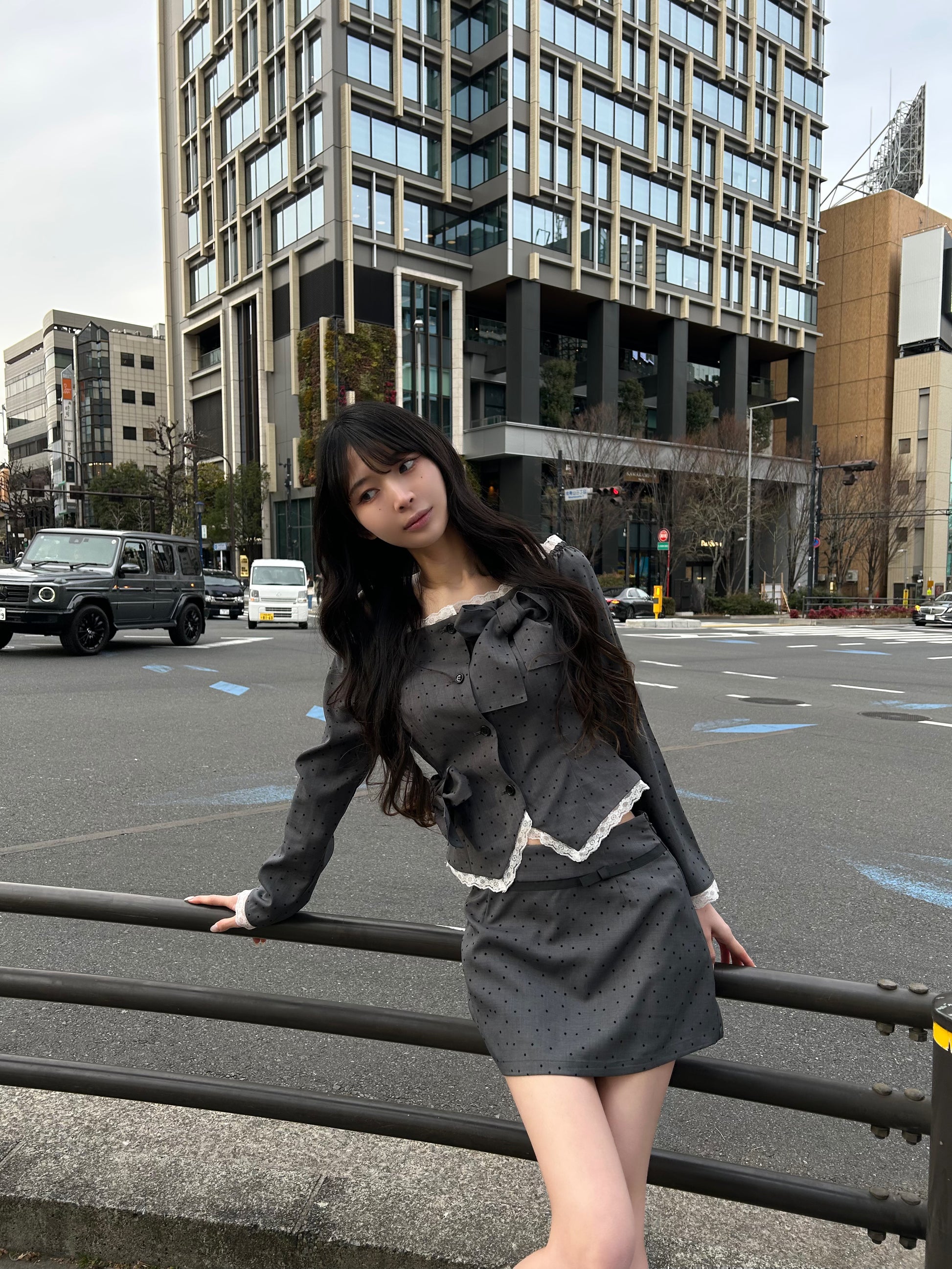 同素材のミニスカートと合わせて、