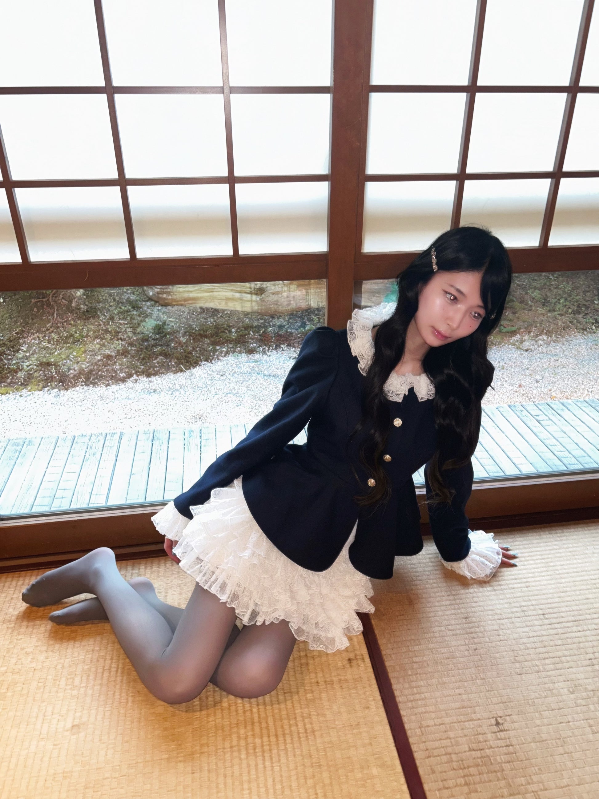 首元と袖口には繊細なレースをあしらい、