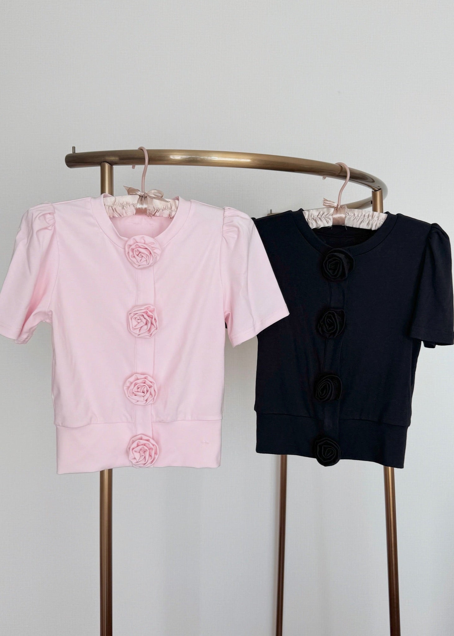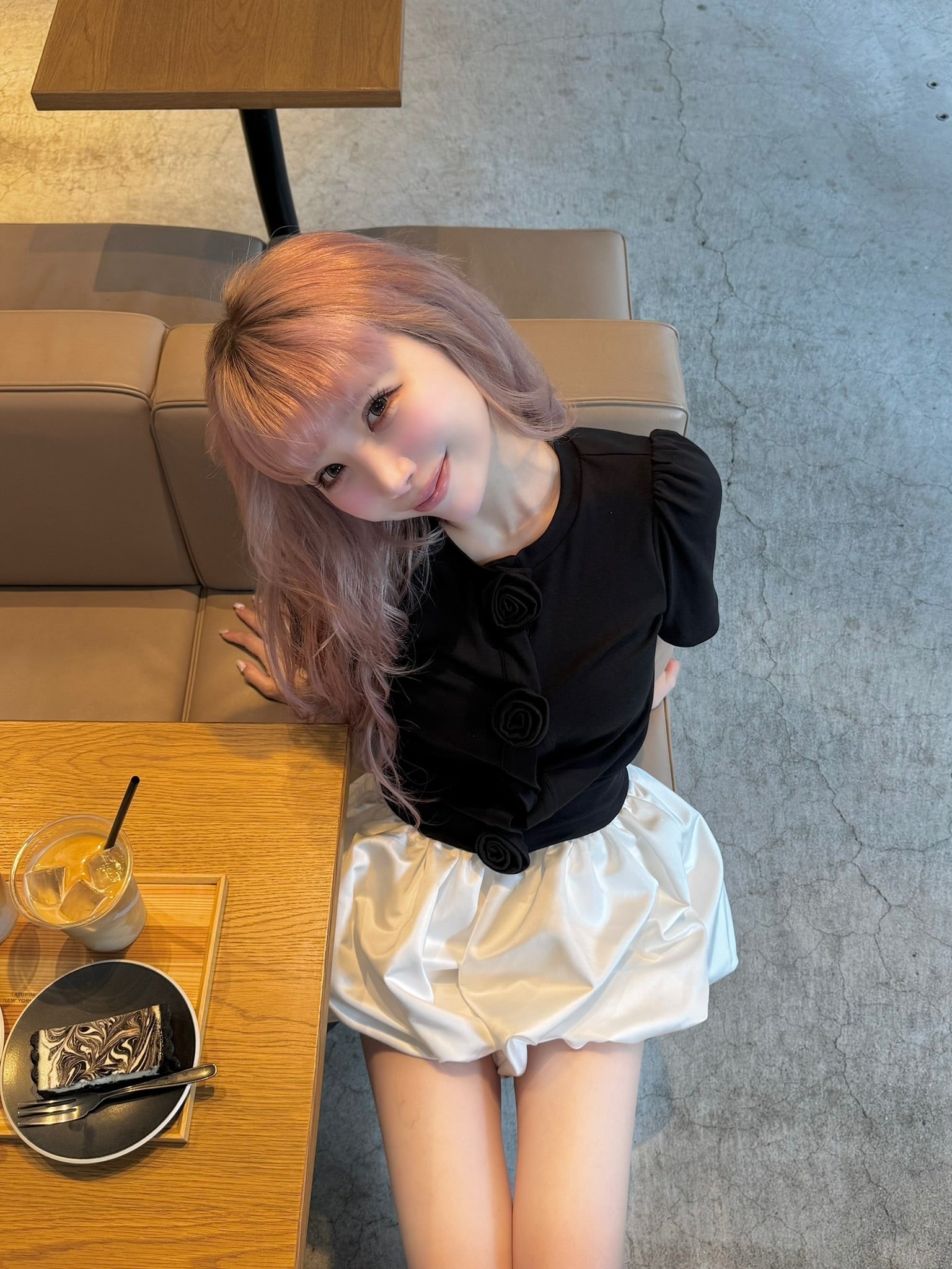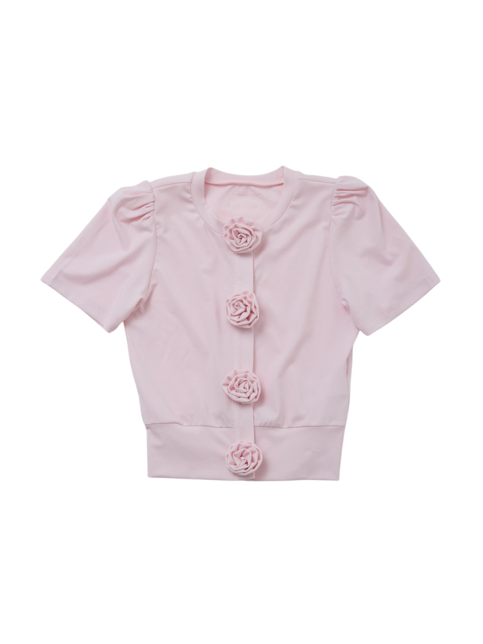 胸元に並んだ立体的なローズディテールが、甘さと上品さをプラスしてくれるアイコニックな一枚。