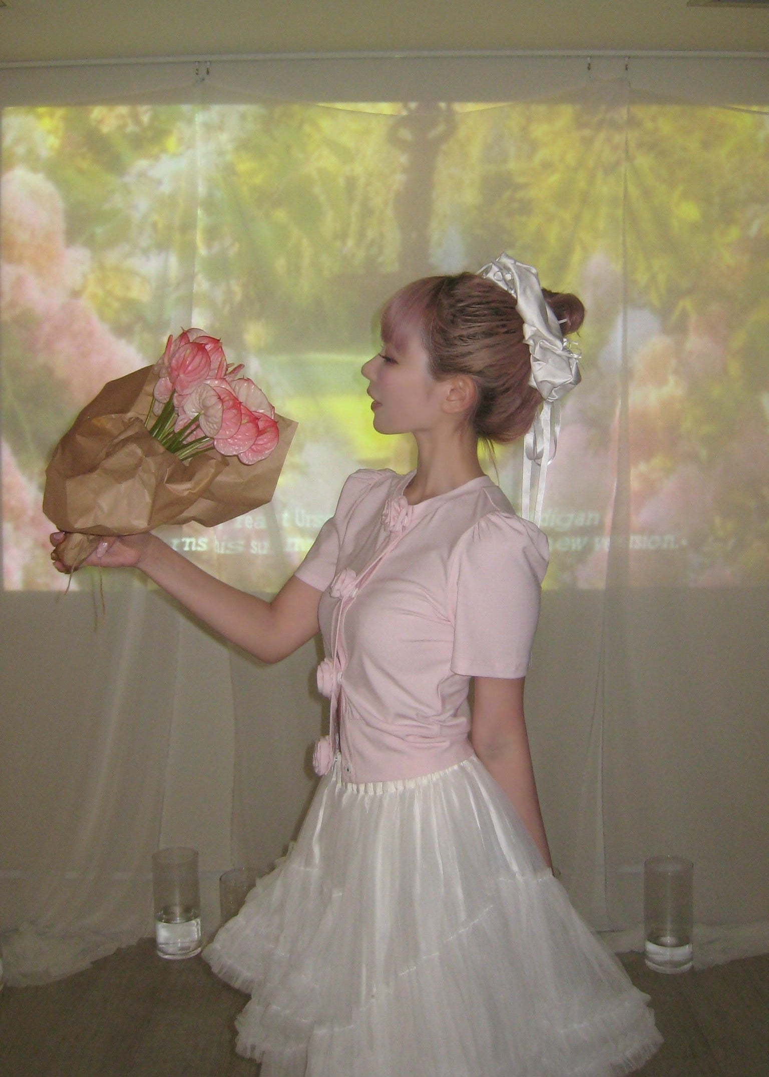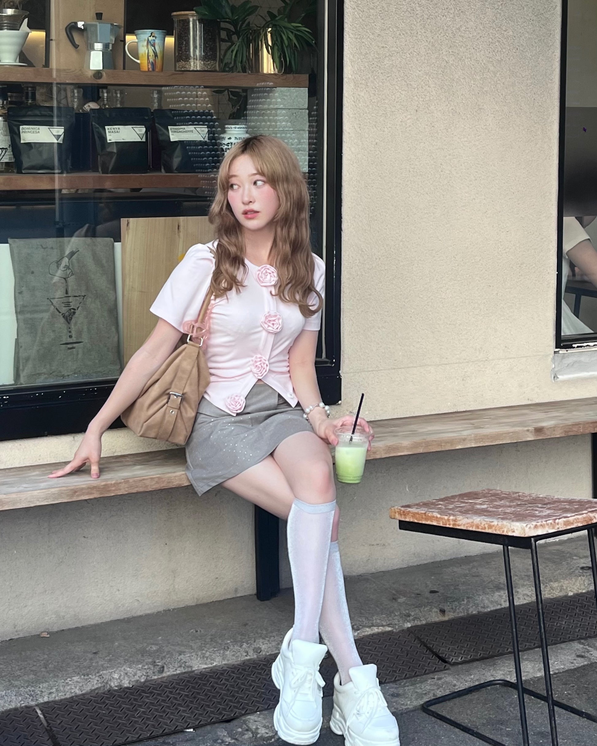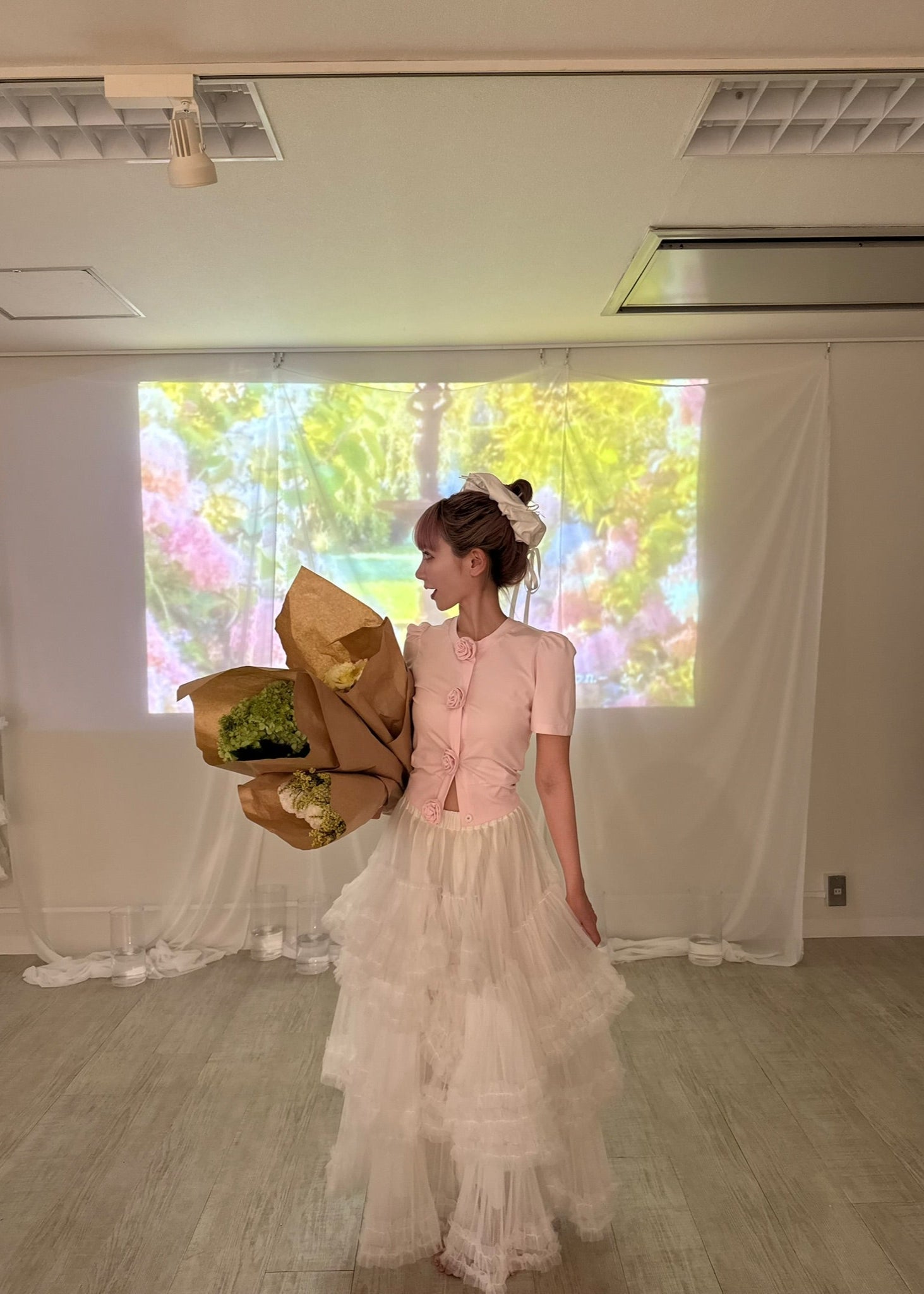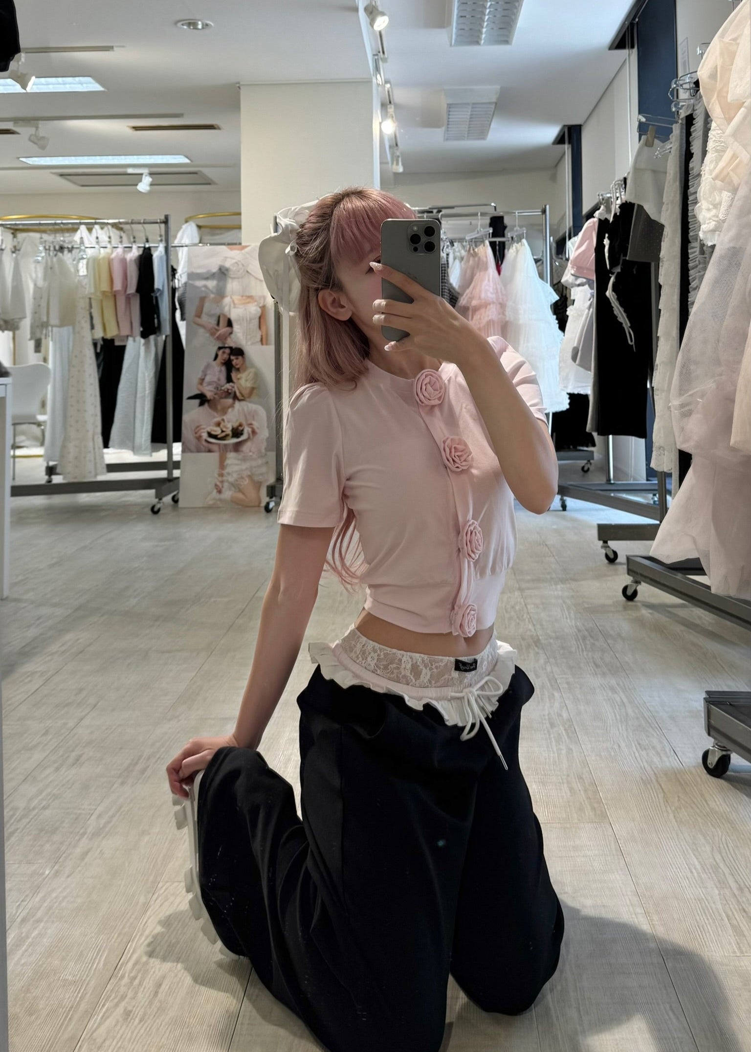 胸元に並んだ立体的なローズディテールが、甘さと上品さをプラスしてくれるアイコニックな一枚。