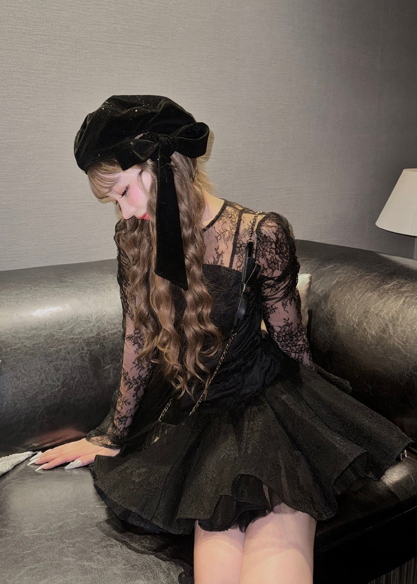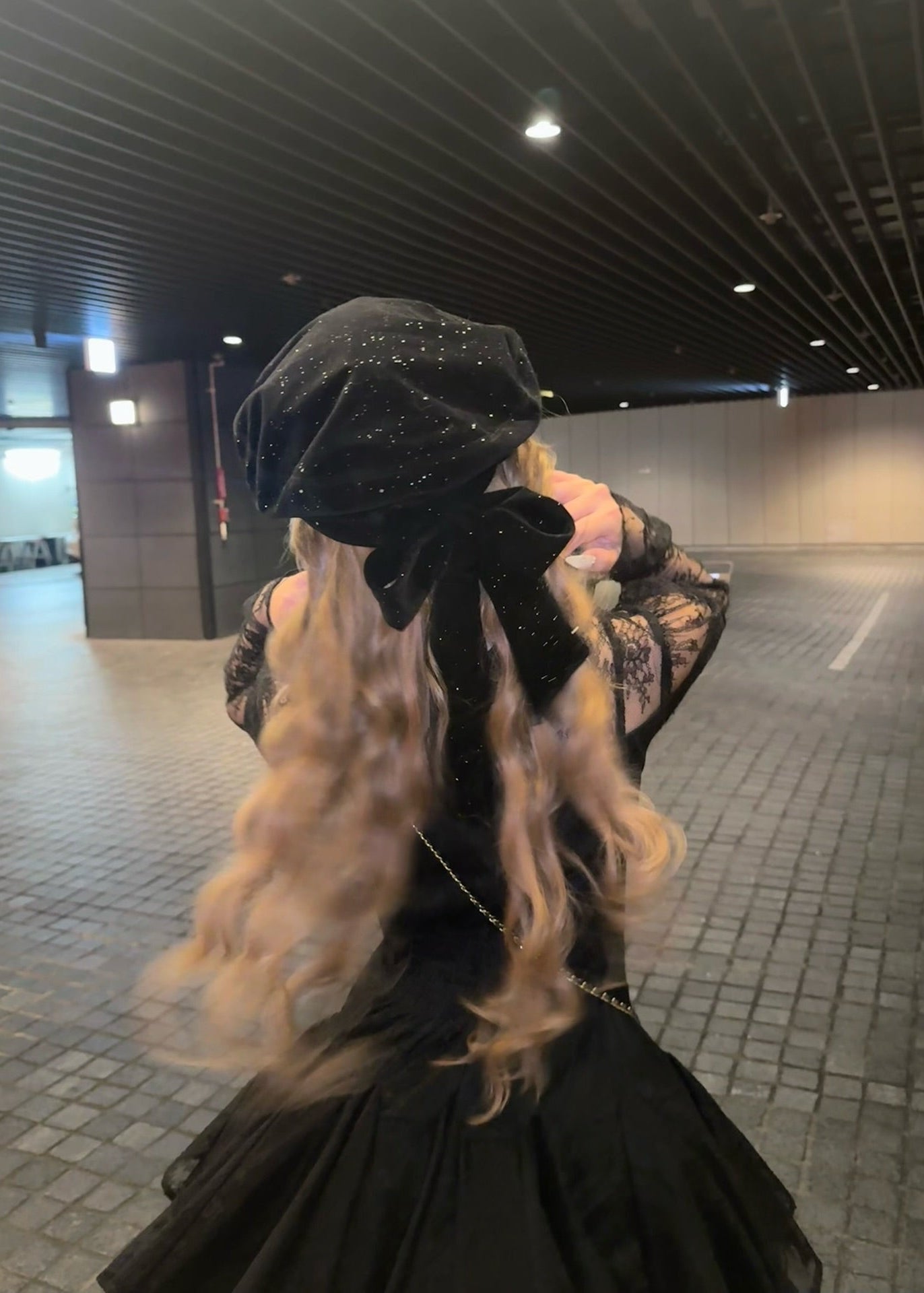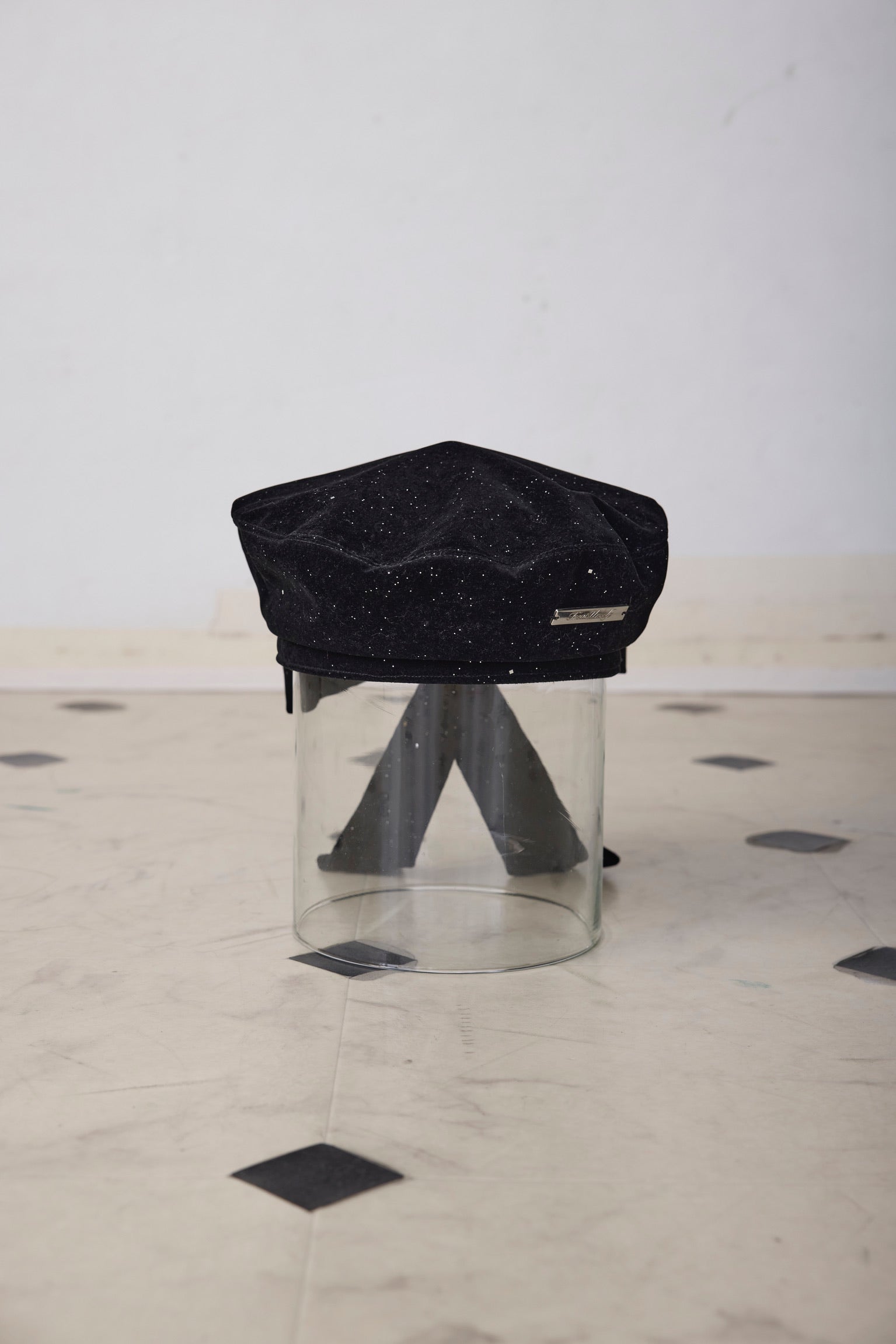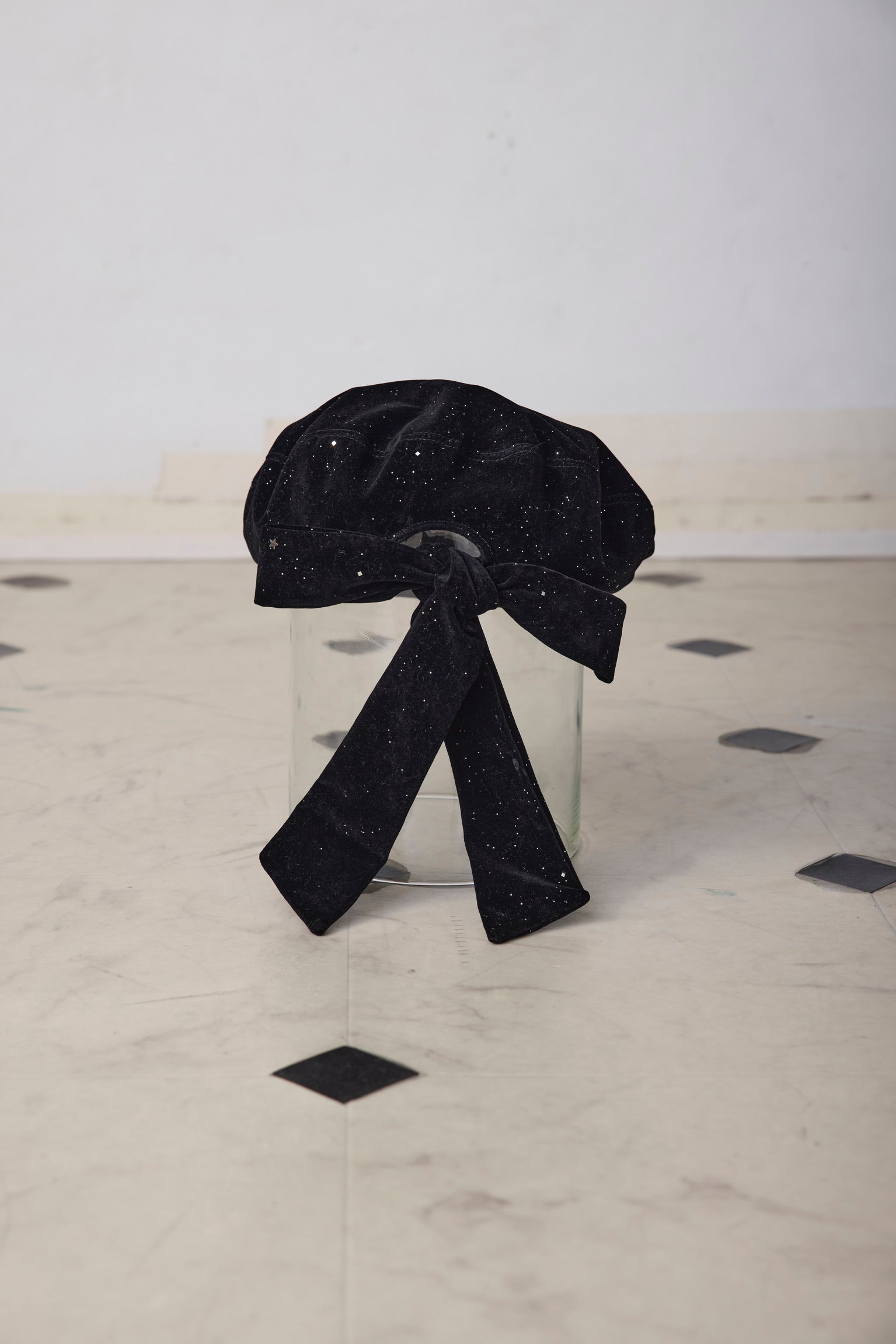 柔らかなベロア素材に、煌めくラメをあしらったリボン付きベレー帽。