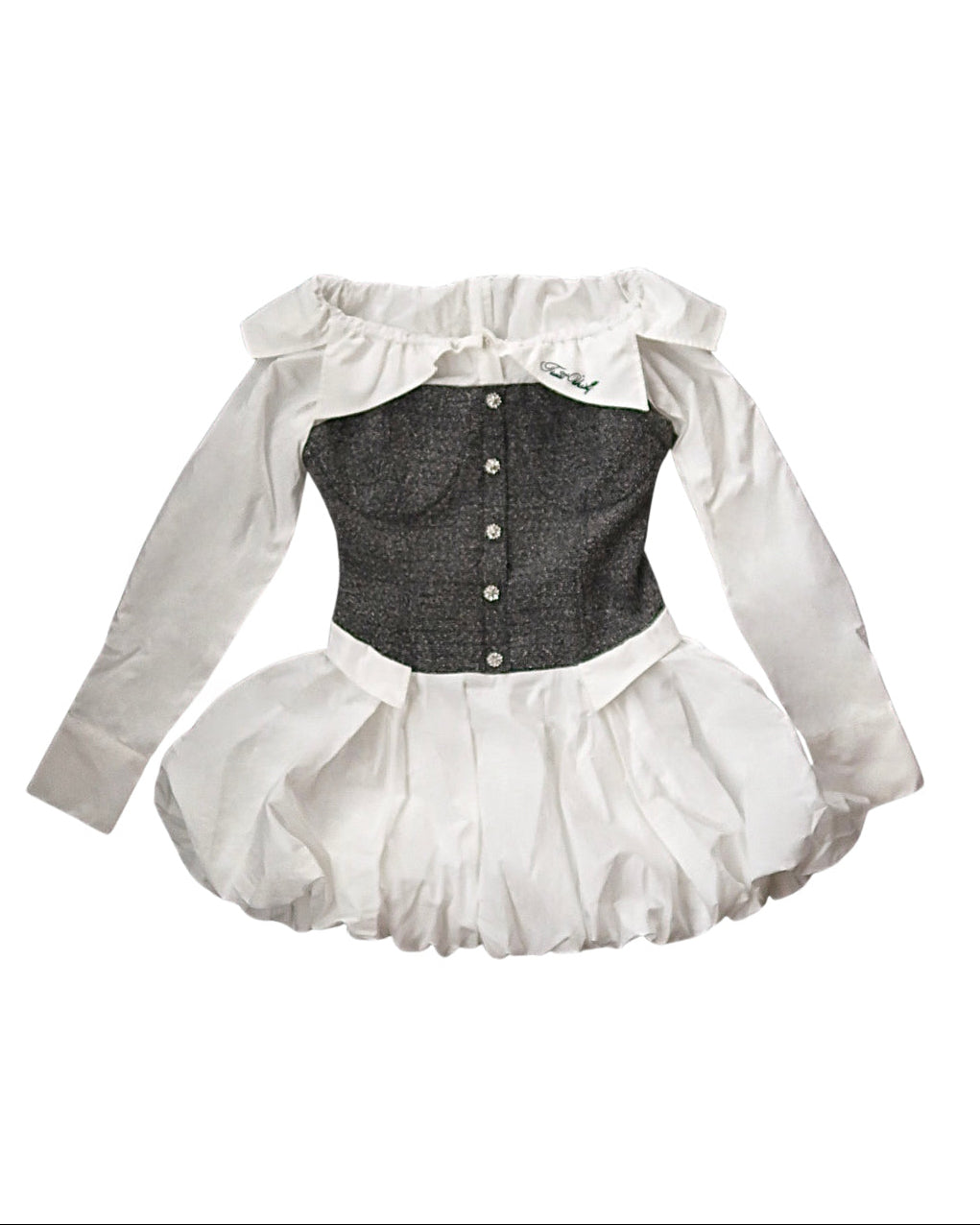 胸元の飾りビジューボタンで煌めきを加え